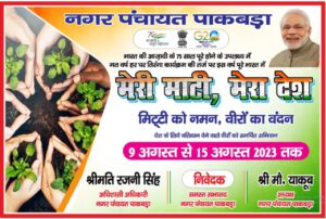 उत्तर प्रदेश मुरादाबाद जिले की नगर पंचायत पाकबड़ा में अमृत काल के इस वर्ष के स्वतंत्रता दिवस के आयोजन से संबंधित “मेरी माटी मेरा देश” अभियान की कार्ययोजना के अनुसार देश के लिए जीवन न्यौछावर करने वाले वीरों के सम्मान में “नगर पंचायत पाकबड़ा कार्यालय के प्रांगड़” में “शिलाफलकम्” का माल्यार्पण अध्यक्ष नगर पंचायत पाकबड़ा मोहम्मद याक़ूब जी, सम्मानित सभासद सदस्यों , नगर पंचायत स्टाफ की उपस्थिती में किया गया! आदरणीय प्रधानमंत्री श्री नरेंद्र मोदी जी द्वारा अमृत काल के लिए दिए गये “पंच प्रण” की भी शपथ ली गई जिसमें नगर पंचायत स्टॉफ द्वारा रंगोली भी बनाई गई। नगर पंचायत पाकबड़ा चेयरमैन व सम्मानित सभासदों द्वारा “अमृत कलश” में नगर पंचायत पाकबड़ा के सभी वार्ड की मिट्टी भी भरी गयी।कार्यक्रम का समापन राष्ट्रगान गायन से किया गया!