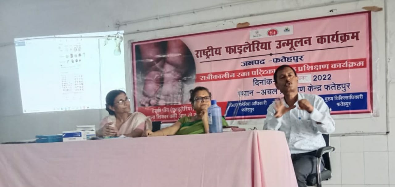 उत्तर प्रदेश फतेहपुर जिले में स्वास्थ्य एवं परिवार कल्याण मंत्रालय भारत सरकार के अंतर्गत राष्ट्रीय फाइलेरिया उन्मूलन कार्यक्रम के तहत रात्रिकालीन रक्त पटिटका संग्रह प्रशिक्षण कार्यक्रम का आयोजन किया गया। रिसर्च आफीसर आरओएच एंड फेमिली वेलफेयर डी०एन० गिरि और रिसर्च कंसल्टेंट भारत सरकार आशीष बाजपेई ने अचल प्रशिक्षण केंद्र में लैब असिस्टेंट और लैब टेक्नीशियन को नाइट ब्लड सर्वे प्रशिक्षण दिया। विशेषज्ञों ने बताया कि रात में 8.30 से रात्रि 12 बजे के बीच जो ब्लड का सैंपल लिया जाता है। उसमे फाइलेरिया की सटीक और सही रिपोर्ट आती है। इसलिये कम लोगों की ही जांच करें लेकिन सही करें।