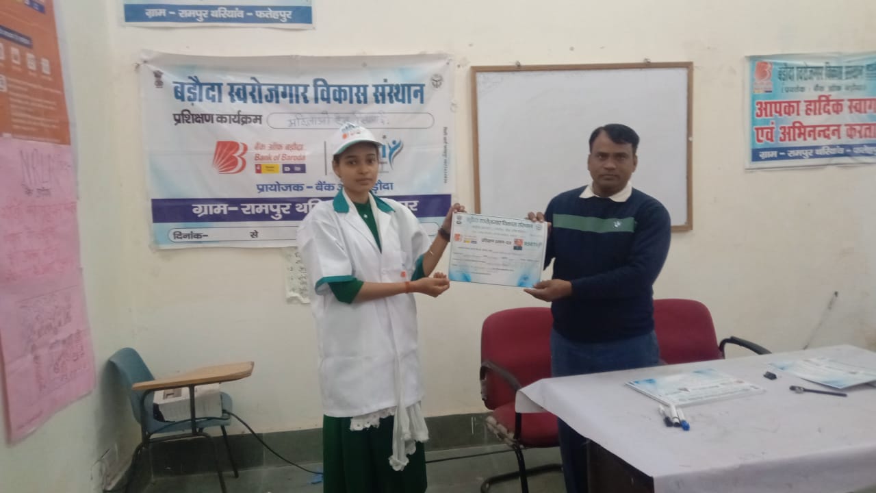 उत्तर प्रदेश फतेहपुर जिले में बड़ौदा स्वरोजगार विकास संस्थान रामपुर थरियांव फतेहपुर द्वारा कूंधन ग्राम पंचायत में निःशुल्क तीस दिवसीय प्रशिक्षण कार्यक्रम का समापन संस्थान के निदेशक प्रतीक शर्मा के नेतृत्व में किया गया। इस कार्यक्रम का संचालन संकाय सदस्य सतेन्द्र कुमार ने किया। संस्थान के निदेशक प्रतीक शर्मा ने प्रशिक्षणार्थियों को सम्बोधित करते हुए कहा कि आज के युग में कैसे महिलाओं को आदमी के संग कदम ताल की जरूरत है। और इन्होंने इसके महत्व के बारे में जानकारी देते हुए अपने व्यावसाय को शीघ्र प्रारम्भ करने हेतु प्रेरित किया। साथ ही गांव में रहकर ही सिलाई के क्षेत्र में अपार सम्भावनाए बता कर अपनी आय बढ़ाने हेतु इसके बारे में विस्तृत जानकारी दिया। साथ ही प्रशिक्षार्थियों को उत्साहवर्धन भी किया। उन्हें शुभकामनाएं देने के साथ साथ बैंक योजनाओं की विस्तारपूर्वक जानकारी दिया। जिससे आगे चलकर प्रशिक्षणार्थियों को कोई किसी प्रकार की दिक्कतें न आएं। तथा कैसे बैंक से जुड़कर ही कैसे समृद्धि करी जा सकती है इसके फायदे भी बताएं। इसके साथ ही कहा कि प्रशिक्षण के उद्देश्य को साकार करने हेतु दृढ़ संकल्पित काम शुरू करने की अपील किया। लिखित परीक्षा एवं प्रायोगिक जांच के बाद 31 प्रशिक्षणार्थियों को सहभागिता प्रमाण पत्र प्रदान किया।