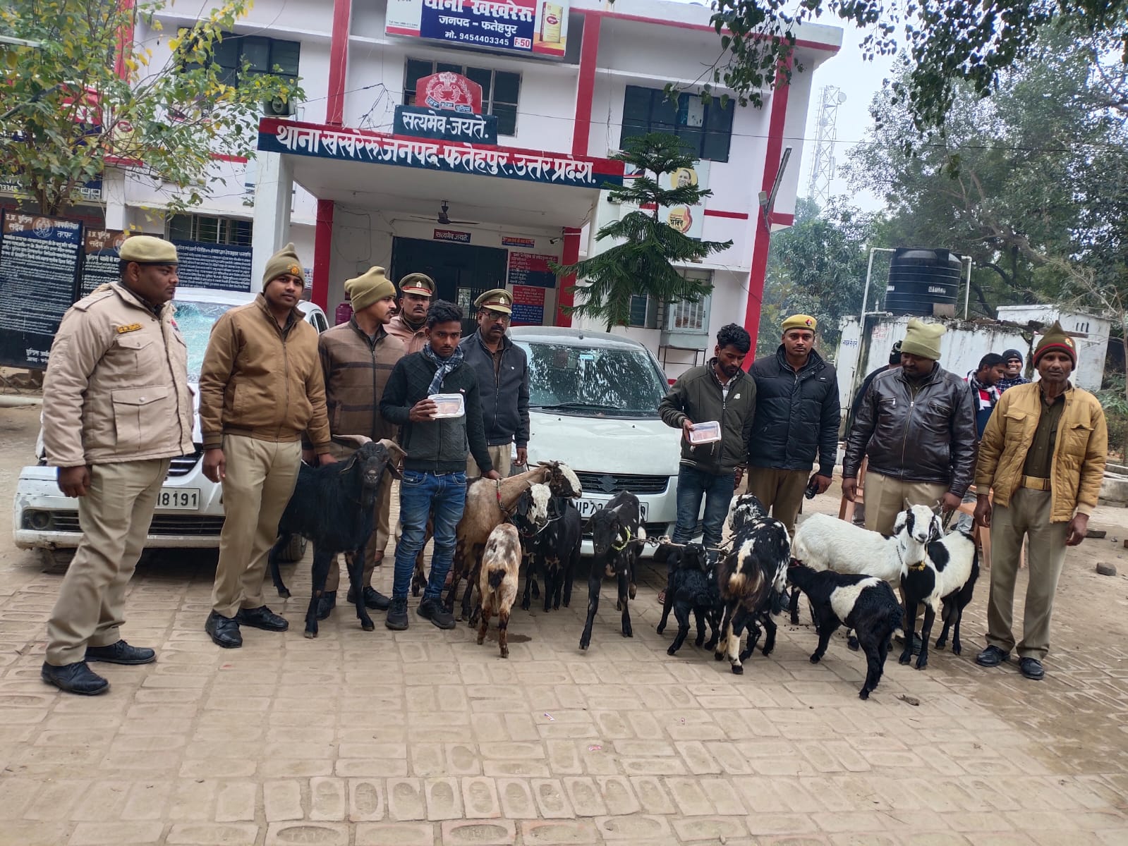 फतेहपुर पुलिस अधीक्षक के निर्देशन में चलाए जा रहे अपराध एवं अपराधियों के विरुद्ध अभियान के कृम में अपर पुलिस अधीक्षक व क्षेत्राधिकारी के कुशल पर्यवेक्षण में प्रभारी निरीक्षक खखरेरू प्रमोद कुमार के नेतृत्व में मुखबिर की सूचना पर पौली के समीप चेकिंग के दौरान पुलिस ने दो कार चोरी गयी 13 बकरा बकरियां सहित दो अभियुक्तों को गिरफ्तार कर न्यायालय भेज दिया। उत्तर प्रदेश फतेहपुर जिले के खखरेरू थाना क्षेत्र के बरहटा गांव निवासी सलमान उम्र लगभग 22 वर्ष पुत्र सलीम व अंजना कबीर गांव निवासी मनोज उम्र लगभग 25 पुत्र जीराखन को मुखबिर की सूचना पर पुलिस ने पौली गांव के स्थित शेखपीर बाबा के समीप बनी पुलिया के पास से चेकिंग दौरान गिरफ्तार किया गया है।जिनके पास से तलासी दौरान पुलिस ने दो कार व 13 बकरा बकरियां ,दो अभियुक्तों सहित 1हजार रुपए नगद बरामद किया। जिन्हें मुकदमा अपराध संख्या 28323 की धारा 380/411/413 के तहत मुकदमा पंजीकृत कर न्यायालय भेज दिया। थाना प्रभारी निरीक्षक प्रमोद कुमार सिंह ने बताया कि मुखबिर की सूचना पर बताए गए स्थान पर चेकिंग व तलासी दौरान दोनों अभियुक्तों के कार से चोरी की गयी 13 बकरा बकरियां व जहानाबाद में चोरी गयी बकरियों को बेचकर प्राप्त धनराशि में से बची धनराशि 1000 रुपए बरामद किया गया है। और चालानी कार्रवाही कर न्यायालय भेजकर वाहनों को 207 एक्ट के तहत सीज कर दिया गया है। और इन्होंने बताया कि इनका अपराधिक इतिहास भी है। सलमान के ऊपर दो मुकदमे खखरेरू थाना व एक मुकदमा जहानाबाद थाने में पंजीकृत हैं। और मनोज के ऊपर पांच मुकदमें पंजीकृत हैं। जिनमें से दो खखरेरू , एक जहानाबाद व दो मुकदमे मंझनपुर कौशांबी जनपद में पंजीकृत हैं।तथा इन्होंने बताया कि पकड़ने वाली टीम में उपनिरीक्षक हजारीलाल, नारायण यादव हेड कांस्टेबिल राजेश सिंह,विवेका नंद,विजय शुक्ला , कान्स्टेबल अमित दुबे,दीपक कुमार आदि मौजूद रहे।