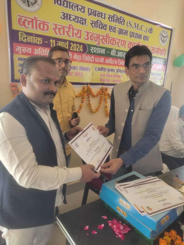 उत्तर प्रदेश फतेहपुर जिले में विद्यालय प्रबंधन समिति के अध्यक्ष, सचिव एवं ग्राम प्रधान का ब्लांक स्तरीय उन्मुखीकरण कार्यशाला एवं संगोष्ठी का ब्लांक परिसर के सभागार कक्ष विजयीपुर में आयोजित किया गया। जिसमें कार्यशाला में सभी प्राथमिक और कंपोजिट विद्यालयों के प्रधान अध्यक्ष व प्रधान अध्यापकों ने प्रतिभाग किया। खागा तहसील क्षेत्र के विजयीपुर ब्लांक परिसर के सभागार कक्ष में खण्ड शिक्षा अधिकारी विजयीपुर रजनीश श्रीवास्तव ने ब्लांक सभागार में उपस्थित प्रबंध अध्यक्षों को उनके अधिकार व दायित्वों का बोध कराते हुए प्रधान अध्यापकों को अपने विद्यालयो को निपुण बनाने के लिए प्रेरित किया। और इन्होंने बताया कि जिन्होंने अपने विद्यालयो को निपुण कर लिया है ऐसे ब्लांक के 10 विद्यालयों के प्रधान अध्यापकों को भी सम्मानित किया गया है। इस मौके पर खण्ड विकास अधिकारी, खण्ड शिक्षा अधिकारी सहित ब्लांक अकादमिक सहयोगी प्राथमिक विद्यालय रामपुर प्रकाश अग्रवाल, कंपोजिट विद्यालय सूदनपुर सतेंद्र पांडेय, प्राथमिक विद्यालय पाम्हीपुर हेर्षित राज, प्रधान अध्यापक जयचन्द, मनीष सचान, योगेन्द्र पटेल, संतोष सिंह सहित अन्य लोग मौजूद रहे।