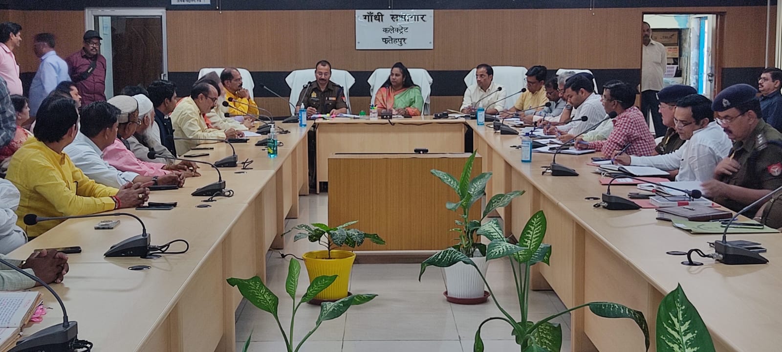 उत्तर प्रदेश फतेहपुर जिले में आगामी त्यौहारो होली, चैत्र नवरात्रि, ईद–उल–फितर(ईद) पर्व को दृष्टिगत रखते हुए आपसी भाईचारा सौहार्दपूर्ण एवं शांति व्यवस्था बनाए रखने हेतु पीस कमेटी की बैठक कलेक्ट्रेट महात्मा गांधी सभागार में जिलाधिकारी सी. इंदुमती, पुलिस अधीक्षक उदय शंकर सिंह के संयुक्त तत्वाधान में संपन्न हुई।बैठक में जिलाधिकारी ने तहसील और थाना क्षेत्रों से आये हुए शांति समिति के सदस्यों एवं सम्भ्रान्त व्यक्तियों को होली, चैत्र नवरात्रि, ईद–उल–फितर(ईद) सहित अन्य त्यौहारों की हार्दिक शुभ कामानाएं देते हुए कहा कि जनपद में विभिन्न समुदाय के त्यौहारो को शांतिपूर्ण एवं एक दूसरे की भावनाओं की कद्र करते हुए मिलजुल कर मनाये जाने की परम्परा रही है, उसी परम्परा का निर्वहन करते हुए हम सब इस बार भी सभी त्यौहारो को शांतिपूर्ण एवं सुरक्षित तरीके से आम जनमानस की सुविधाओं का विशेष ध्यान रखाकर मनाए।