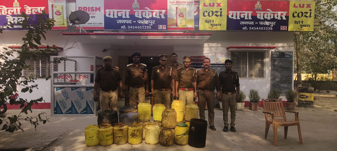 उत्तर प्रदेश फतेहपुर जिले के बकेवर थानां पुलिस टीम द्वारा तीन फरार आरोपियों से 150 लीटर अवैध कच्ची देशी शराब तथा मौके से शराब बनाने के उपकरण व कुल 04 कुन्तल 50 कि0ग्र लहन व 03 भट्टी नष्ट किया गया। पुलिस अधीक्षक के आदेशानुसार व अपर पुलिस अधीक्षक के निर्देशन एवं क्षेत्राधिकारी बिन्दकी के निकट पर्वेक्षण में थानाध्यक्ष बकेवर के कुशल नेतृत्व में शासन द्वारा आबकारी की अवैध विक्री व निष्कर्षण एवं तस्करी के विरुद्ध चलाये जा रहे अभियान में आज थाना बकेवर पुलिस टीम एवं आबकारी टीम द्वारा चलाये गये संयुक्त चेकिंग अभियान के दौरान ग्राम कंजरन डेरा मजरे बेता थाना बकेवर से मुखबिर की सूचना पर तलाश व दबिश दी गयी मौके से 03 फरार थानां क्षेत्र के कजरन डेरा निवासी ओम प्रकाश का 35 वर्षीय पुत्र झुरी व गाँव निवासी स्व० मिश्रीलाल का 32 वर्षीय पुत्र ज्ञान सिंह और गाँव निवासी नत्थू का 30 वर्षीय पुत्र मलखान उर्फ पच्चू के कब्जे से 03 प्लास्टिक के डिब्बे में कुल 150 लीटर अवैध कच्ची शराब मय शराब बनाने का उपकरण व 4.50 कुन्तल लहन बरामद कर लहन को नष्ट किया गया तथा मौके से 03 आरोपीय मौका पाकर भाग गए। मौके पर 03 डिब्बे में कुल 150 लीटर अवैध कच्ची शराब मय उपकरण व 4.50 कुन्तल लहन बरामद कर व 03 भट्टी को नष्ट किया गया। भागे हुये आरोपीयो का नाम पता की जानकारी की गयी। इस सम्बन्ध में थाना स्थानीय पर तीनों के विरुद्ध 60(2) आबकारी अधिनियम में अभियोग पंजीकृत किया गया।