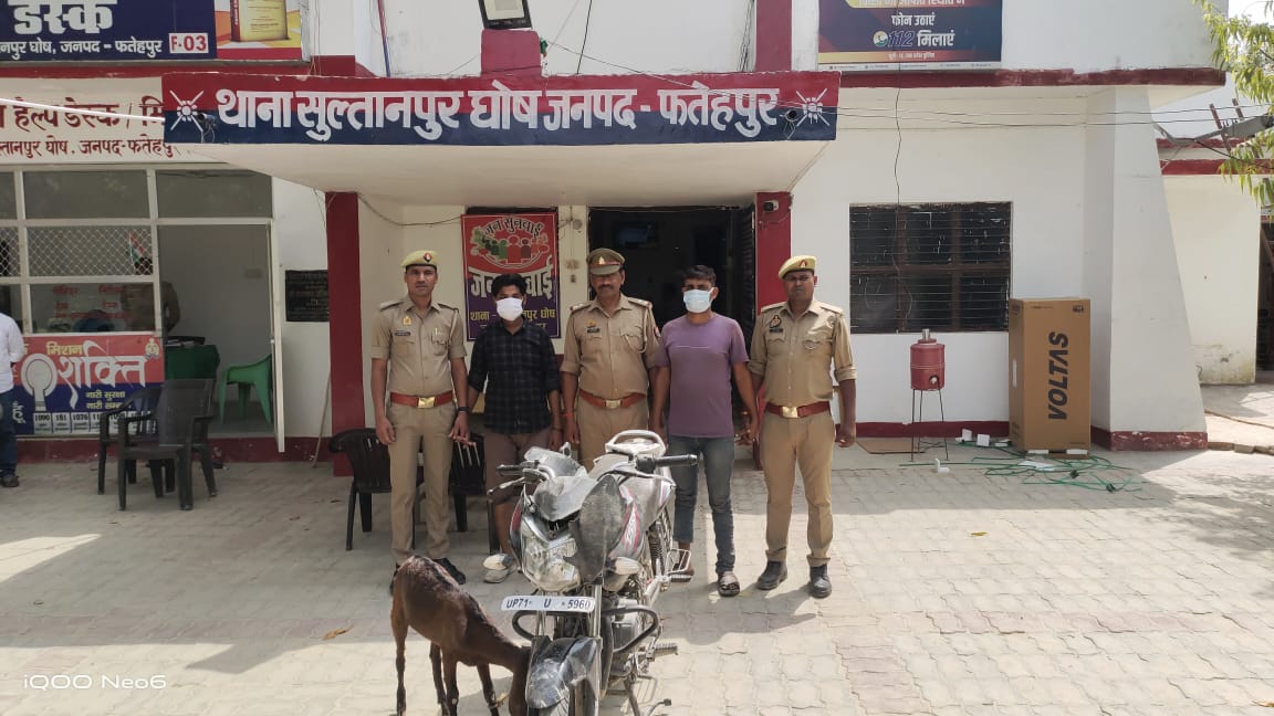 उत्तर प्रदेश फतेहपुर जिले के सुल्तानपुर घोष थाने की पुलिस ने थाने पर दर्ज चोरी के मुकदमें से सम्बंधित दो आरोपियों को गिरफ्तार कर उनके कब्जे से चोरी किया गया बकरा, अवैध तमंचा कारतूस व घटना में उपयोग मोटर साइकिल बरामद किया। थाना पुलिस ने चेकिंग के दौरान मुखबिर की सूचना पर थाने पर दर्ज मुकदमे के आधार पर हथगाँम थानां क्षेत्र के रामपुर मुआरी गाँव निवासी नियाजुद्दीन के 38 वर्षीय पुत्र कुर्बान उल्ला उर्फ कुर्बान अली व गाँव निवासी मन्सूर के 32 वर्षीय पुत्र मोहीउद्दीन को कर्मेपुर मोड़ के पास से गिरफ्तार किया। उनके कब्जे से चोरी किया गया बकरा और जामा तलाशी से एक अदद तमंचा 315 बोर व एक अदद जिंदा कारतूस 315 बोर बरामद किया गया। बरामद बकरे की पहचान कराकर वादी को सुपुर्द कर आरोपियों को न्यायालय रवाना किया गया।