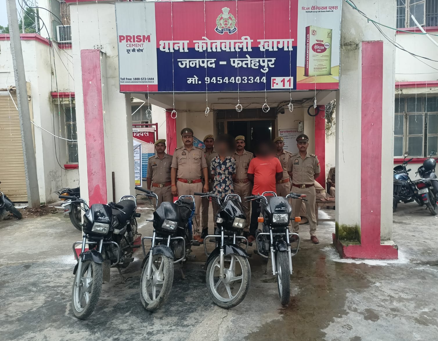 उत्तर प्रदेश फतेहपुर जिले की खागा कोतवाली पुलिस द्वारा 04 चोरी की मोटर साइकिल सहित दो शातिर चोरों को गिरफ्तार कर लिया। पुलिस अधीक्षक धवल जायसवाल के निर्देशन व अपर पुलिस अधीक्षक विजय शंकर मिश्र के पर्यवेक्षण एवं क्षेत्राधिकारी खागा के नेतृत्व में वांछित/वारण्टियों की गिरफ्तारी व अपराध एवं अपराधियों के विरुद्ध चलाये जा रहे अभियान के क्रम में आज 26 अगस्त को खागा पुलिस द्वारा चेकिंग के दौरान जरिये मुखबिर सूचना पर 02 शातिर मोटर साइकिल चोरों सादिक उर्फ राजा पुत्र मोहम्मद अनीस उम्र 25 वर्ष निवासी सलेमपुर मजरे कल्लनपुर थाना खागा व संजय साहू पुत्र शंकर लाल साहू उम्र 28 वर्ष निवासी प्रेम नगर थाना सुल्तानपुर घोष को चार अदद मोटर साइकिल चोरी की व एक तमंचा मय कारतूस 315 बोर के साथ गिरफ्तार किया गया। गिरफ्तारी व बरामदगी के आधार पर थाना स्थानीय पर मु0अ0स0 245/24 धारा 317(2)/318(4)/336(3)/338 बीएनएस व 3/25 आर्म्स एक्ट पंजीकृत कर गिरफ्तार आरोपीयो को न्यायालय भेजा गया।