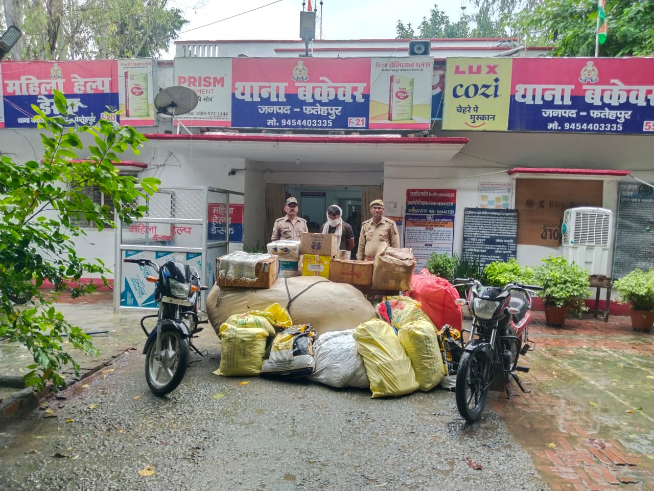 उत्तर प्रदेश फतेहपुर जिले के बकेवर थाने की पुलिस टीम द्वारा अंतर्जनपदीय शातिर चोर को दो चोरी की मोटर साइकिल, चोरी से सम्बंधित माल 100 पैकेट सर्फ एक्सल, एलइडी बल्ब आदि सहित बरामद कर किया गया गिरफ्तार। पुलिस अधीक्षक धवल जायसवाल के निर्देशन व अपर पुलिस अधीक्षक विजय शंकर मिश्र एवं क्षेत्राधिकारी बिन्दकी के पर्यवेक्षण में अपराध एवं अपराधियों के विरुद्ध चलाये जा रहे अभियान में आज 28 अगस्त को समय करीब 9.30 बजे थाना बकेवर पुलिस द्वारा जरिये मुखबिर सूचना पर बैठका चौराहा से एक आरोपी राहुल मिश्रा पुत्र अरुन कुमार मिश्रा निवासी ग्राम केशवपुर मेलहिया थाना हथगाँव उम्र 24 वर्ष को मय चोरी के मोटर साइकिल बजाज सीटी 100 नं0 UP78FS9939 व एक गत्ते में 63 अदद वेटो कम्पनी की LED बल्ब व एक प्लास्टिक के बोरे में सर्फ एक्सल 100 पैकेट के हिरासत पुलिस में लिया गया। पूछताछ में पाया गया कि बरामदशुदा प्लास्टिक के बोरे में सर्फ एक्सल 100 पैकेट जो थाना स्थानीय पर पंजीकृत मु0अ0सं0 85/2024 धारा 303(2)/317(2)/3(5) बीएनएस से संबंधित है। अभियुक्त की निशांदेही पर उसके घर ग्राम केशवपुर मेलहिया थाना हथगाँव से एक अदद मोटरसाईकिल पैशन प्रो नं0 UP91M8841 जिसके संबंध में थाना हनुमन्त बिहार जनपद कानपुर नगर में मु0अ0सं0 106/24 पंजीकृत है व एक गत्ते में प्लास्टिक की कोनिया, एक गत्ते में प्लास्टिक के गिलास, एक बण्डल में ट्रैक शूट, दो प्लास्टिक की बोरी में 10 अदद लालटेन, एक गत्ते में सनराइज मसाला 90 पैकेट, 11 अदद प्लास्टिक का धागा, 6 डिब्बा 1-1 लीटर का एशियन पैन्ट, 17 डिब्बा 1-1 लीटर का डिलक्स पेन्ट , दो डिब्बा 10 लीटर का एशियन पेन्ट, 1 डिब्बा 5 लीटर का प्राइमर एक गत्ता शताब्दी शीड, एक बोरी में 36 पैकेट व एक बोरी में 38 पैकेट 500 ग्राम का अज्वाइन, 1 बोरी में नौ पैकेट सिनेमा गुलाल, 1 बन्डल में 16 अदद KTM कम्पनी के ट्रैक्टर का शी0 कवर, 5 अदद ट्रैक्टर का हैन्डिल कवर, एक अदद गत्ते में 95 पाउच के अमूल दूध के पैकेट, 6 अदद 400 ग्राम व 19 अदद 80 ग्राम की सेवई कम्पनी मेमोस, 9 अदद तेल कम्पनी कियो कार्पिन, 19 अदद गोल्डी विरयानी मसाला, 1 प्लास्टिक की काले रंग की त्रिपाल, एक अदद रोस्टर मशीन कैन्ट, एक प्लास्टिक की बोरी में चावल ,एक झाल में जैकेट लोवर आदि मिक्स कपडे, व दो प्लास्टिक की पन्नी में इनर मोजे कैप, जैकेट टीशर्ट आदि बरामद हुआ गिरफ्तारी व बरामदगी के आधार पर थाना स्थानीय पर मु0अ0सं0 107/24 धारा 317(2)/317(4)/317(5)/318(4)/319(2) बीएनएस पंजीकृत कर गिरफ्तार आरोपी राहुल मिश्रा को न्यायालय रवाना किया गया।