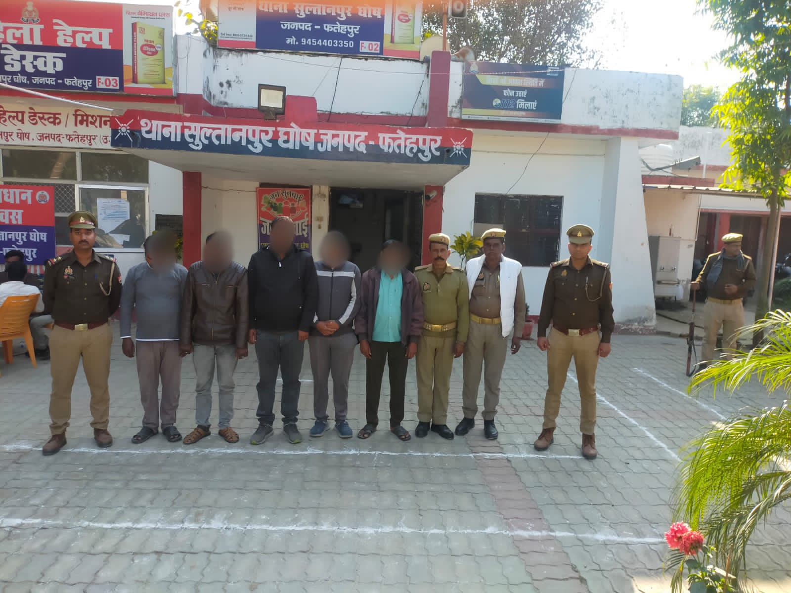 उत्तर प्रदेश फतेहपुर जिले के सुल्तानपुर घोष थाने की पुलिस द्वारा हार जीत की बाजी लगा कर जुआ खेलते हुये पाँच आरोपियो को मालफड़ व जामा तलाशी से प्राप्त कुल 10,900/-रूपये के साथ गिरफ्तार किया गया। पुलिस अधीक्षक द्वारा चलाये जा रहे अभियान में 24 जनवरी को थाना सुल्तानपुर घोष पुलिस टीम के द्वारा मुखबिर की सूचना पर थाना क्षेत्र के आरामपुर बसई गाँव निवासी मैनुद्दीन के 39 वर्षीय पुत्र लईक गाँव निवासी मुमताज अहमद के 35 वर्षीय पुत्र सुल्गुलाम किबरिया गाँव निवासी आरामपुर अब्दुल रऊफ के 35 वर्षीय पुत्र मोहर्रम अली गाँव निवासी सदरउद्दीन के 39 वर्षीय पुत्र मैसर बेग थाना क्षेत्र के प्रेमनगर निवासी वहीद के 55 वर्षीय पुत्र रईस अहमद को हार-जीत की बाजी लगाकर जुआ खेलेत हुए नूरी मस्जिद के पीछे प्रेमगनर से मय मालफड़ 8,900/-रूपये व जामा तलाश 2000/-रूपये व 52 अदद ताश की पत्ते के साथ गिरफ्तार किया गया । गिरफ्तारी व बरामदगी के आधार पर थाना स्थानीय पर मु0अ0सं0 11/2025 धारा 13 जुआ अधिनियम पंजीकृत कर आवश्यक कार्यवाई नियमानुसार की जा रही है।
