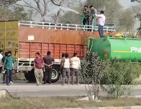 उत्तर प्रदेश फतेहपुर जुले के थरियांव थाना क्षेत्र के कोडरपुर मोड उसरैना के पास अचानक बैट्री से लदे ट्रक में आग लग गई ड्राइवर ने कूद कर बचाई जान, दिल्ली निवासी चालक शिवम कुमार ने बताया कि मैं दिल्ली से रेल्वे की बैट्री लादकर उड़ीसा जा रहा थी जैसे ही थरियांव थाना क्षेत्र के कोडरपुर मोड उसरैना के पास पहुंचा रास्ते मे निकलने वाले राहगीरों ने मुझे रोक कर बताया कि आपकी गाड़ी में आग लगी हुई हैं, जैसे आग की खबर सुनकर ड्राइवर शिवम ने गाड़ी रोकर ट्रक से कूद गया। वही ग्रामीणों ने सूचना पुलिस को दे दी सूचना पाकर मौके पर पहुंची पुलिस ने पानी का टैंकर बुलाकर ट्रक में लगी आग को बुझा दिया। और ट्रक को हाईवे से एक तरफ कर दिया, वही थाना अध्यक्ष अरविंद कुमार राय ने बताया कि ट्रक में बैट्री लदी हुई थी। अनुमान हैं कि बैट्री आपस मिली जुड़ गई होंगी जिसके चिनगारियों से ट्रक में आग लगी हुई होगी, चालक सुरक्षित हैं।