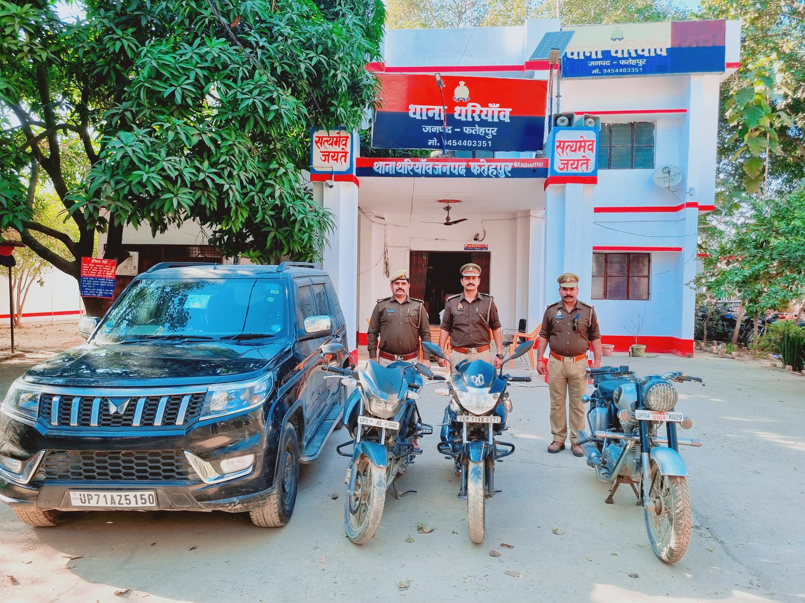 उत्तर प्रदेश फतेहपुर जिले के थरियांव थाने में सदर कोतवाली क्षेत्र के सनगांव गाँव निवासी इफ्तेखार खान के पुत्र गैगेस्टर के आरोपी मो० मोइन खान की बारह लाख अट्ठाइस हजार सात सौ रुपये की सम्पत्ति को धारा 14 (1) गैगेस्टर एक्ट के तहत जब्त किया गया। पुलिस अधीक्षक धवल जायसवाल के निर्देशन में अपराधियों के विरुद्ध चलाये जा रहे अभियान में आज 7 फरवरी को थरियांव थाने की।पुलिस द्वारा गैंगस्टर एक्ट से संबंधित शातिर गैगेस्टर आरोपी मो० मोइन खान पुत्र इफ्तेखार खान निवासी सनगांव सदर कोतवाली की बारह लाख अट्ठाइस हजार सात सौ रुपये की चल/अचल सम्पत्ति को धारा 14 (1) गैगेस्टर एक्ट के तहत जब्त किया गया।।जब्त सम्पति का विवरण UP71AK1229 बोलेरो NEO कीमत 10,15,000 रुपए, बुलेट क्लासिक 350 सीसी कीमत 95,000 रुपए, UP71AE3330 अपाचे आरटीआर 160 सीसी कीमत 53,700 रुपए, UP71AB0171 अपाचे आरटीआर 160 सीसी कीमत 42,000 रुपये, UP71U1363 अपाचे आरटीआर 160 सीसी कीमत 23,000 रूपए, कुल योग 12,28,700/- रुपये।