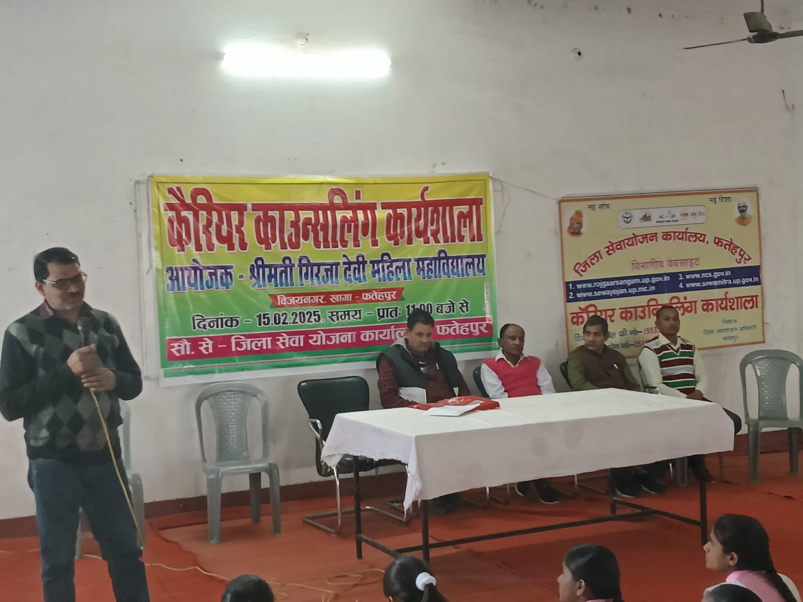 उत्तर प्रदेश शासन एवं प्रशिक्षण एवं सेवायोजन विभाग के संकल्प हर हाथ हर परिवार को रोजगार उपलब्ध कराकर उसे आत्मनिर्भर बनाने हेतु जिला सेवायोजन कार्यालय द्वारा दिनांक 15 फरवरी 2025 को प्रातः 11:00 बजे गिरिजा देवी महाविद्यालय, खागा, में कॅरियर काउन्सिलिंग कार्यशाला का आयोजन किया जायेगा। जिसमें सेवायोजन कार्यालय से शशॉक पान्डेय, प्रभारी कॅरियर काउन्सिलिंग व चन्द्र किशोर, वरिष्ठ सहायक द्वारा विद्यालयों के 117 छात्र/छात्राएं को विभाग के पोर्टल रोजगार संगम पोर्टल, सेवायोजन पोर्टल व एन.सी.एस. पोर्टल के बारे में विस्तार से जानकारी प्रदान कर छात्र/छात्राओं को कॅरियर सम्बन्धी मार्गदर्शन प्रदान किया गया। कार्यक्रम की अध्यक्षता महाविद्यालय के प्राचार्य डा. गिरीश प्रसाद मिश्र द्वारा की गयी।
