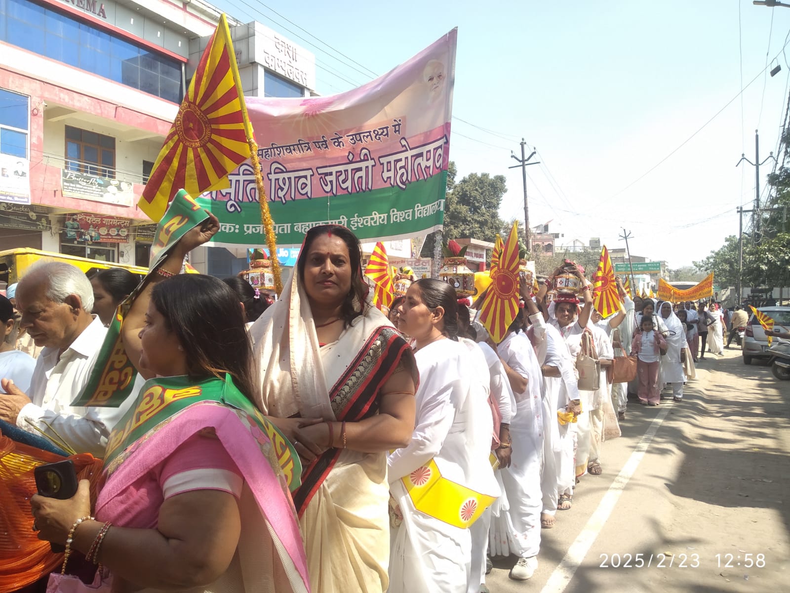 उत्तर प्रदेश फतेहपुर जिले की बिंदकी में प्रजापिता ब्रह्माकुमारी ईश्वरीय विश्वविद्यालय द्वारा शिवजी की शोभायात्रा निकाली गई। भारी पुलिस बल की मौजूदगी में यह शोभायात्रा कस्बे के प्रमुख मार्गो में घूमि। पुलिस क्षेत्राधिकारी ने दीप प्राजूलंकर और पूजा अर्चना कर हरी झंडी दिखाते हुए शोभायात्रा का शुभारंभ किया। इस मौके पर उन्होंने प्रजापिता ब्रह्माकुमारी ईश्वरीय विश्वविद्यालय द्वारा लगातार कई वर्षों से चलाए जा रहे अभियान के तहत सुख और शांति मिलती है लोगों का आत्मविश्वास बढ़ता है। जीवन सफल होता है इस मिशन में काम करने वाले सभी लोग धन्यवाद के पात्र हैं। जानकारी के अनुसार कस्बे के ललौली रोड स्थित प्रजापिता ब्रह्माकुमारी ईश्वरीय विश्वविद्यालय द्वारा रविवार को दिन में करीब 1:00 बजे शिवजी की शोभा यात्रा निकाली गई यह शोभा यात्रा कस्बे के प्रमुख मार्गो में पुलिस के मौजूदगी में घूमी। यात्रा का शुभारंभ पुलिस क्षेत्र अधिकारी वीर सिंह ने पूजा अर्चना कर और हरी झंडी दिखाकर किया। शोभा यात्रा के पहले कार्यक्रम का दीप प्रज्वलन करने के बाद सीओ वीर सिंह ने कहा कि प्रजापिता ब्रह्माकुमारी ईश्वरीय विश्वविद्यालय द्वारा चलाए जा रहे कार्यक्रम के अंतर्गत मनुष्य को आंतरिक सुख शांति एवं आनंद की प्राप्त होती है। एकाग्रता स्मरण शक्ति एवं मनोबल में वृद्धि होती है। गुण तथा विशेषताओं से आकर्षक व्यक्तित्व का निर्माण होता है ।संबंधों में मधुरता आती है मानसिक स्वास्थ्य तथा शारीरिक स्वास्थ्य की प्राप्त होती है। शोभायात्रा प्रजापिता ब्रह्माकुमारी ईश्वरीय विश्वविद्यालय से प्रारंभ हुई और ललौली रोड ललौली चौराहा मुगल रोड होते हुए कस्बे के विभिन्न मार्गो में घूमी। इस मौके पर क्राइम इंस्पेक्टर के अलावा सपा के पूर्व जिला अध्यक्ष रामेश्वर दयाल दयाल ब्रह्माकुमारी सीता, दिव्या, स्वाति के अलावा भारी पुलिस बल मौजूद रहा।