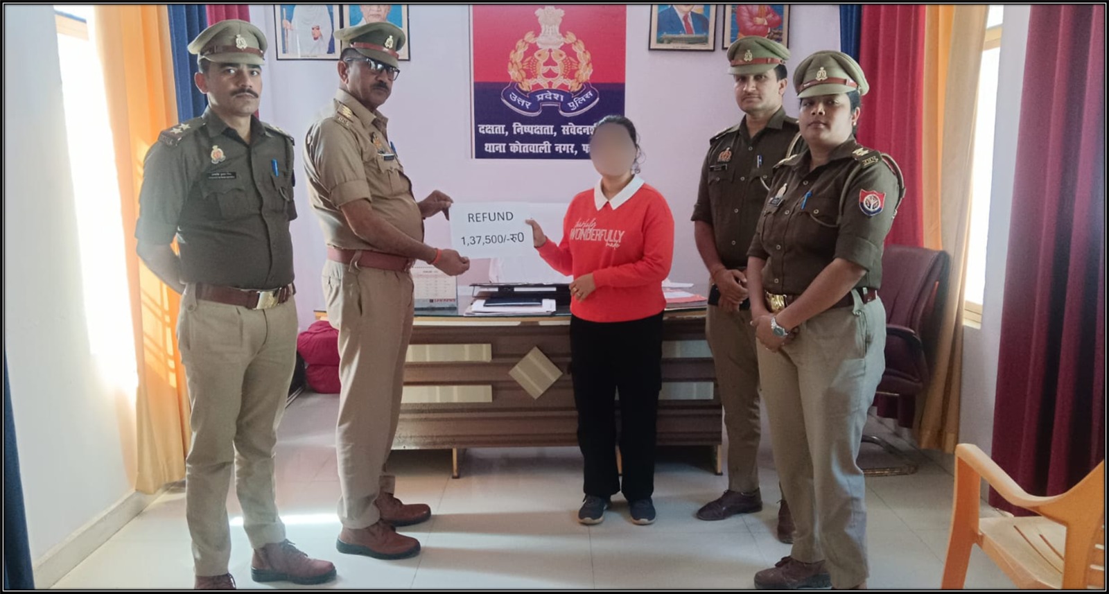उत्तर प्रदेश फतेहपुर साइबर फ्रॉड/पीड़ित आम जनमानस के प्रार्थना पत्रों के निस्तारण अभियान में सदर कोतवाली पुलिस द्वारा ऑनलाइन माध्यम से ठगी के शिकार महिला की 1,37,500 /- रुपये की धनराशि पुनः बैंक खाते में वापस करायी गई। पुलिस अधीक्षक के निर्देशन में साइबर फ्रॉड/पीड़ित आम जनमानस के प्रार्थना पत्रों के निस्तारण अभियान में आज 7 मार्च को थाना कोतवाली पुलिस द्वारा (एनसीआरपी) साइबर पोर्टल पर शिकायत सं0 23107240078400 से सम्बन्धित आवेदक/पीडिता नेहा परिहार पत्नी विनय परिहार निवासी शादीपुर सदर कोतवाली को 1,37,500 /- रुपये उनके खाते में वापस कराये गए।