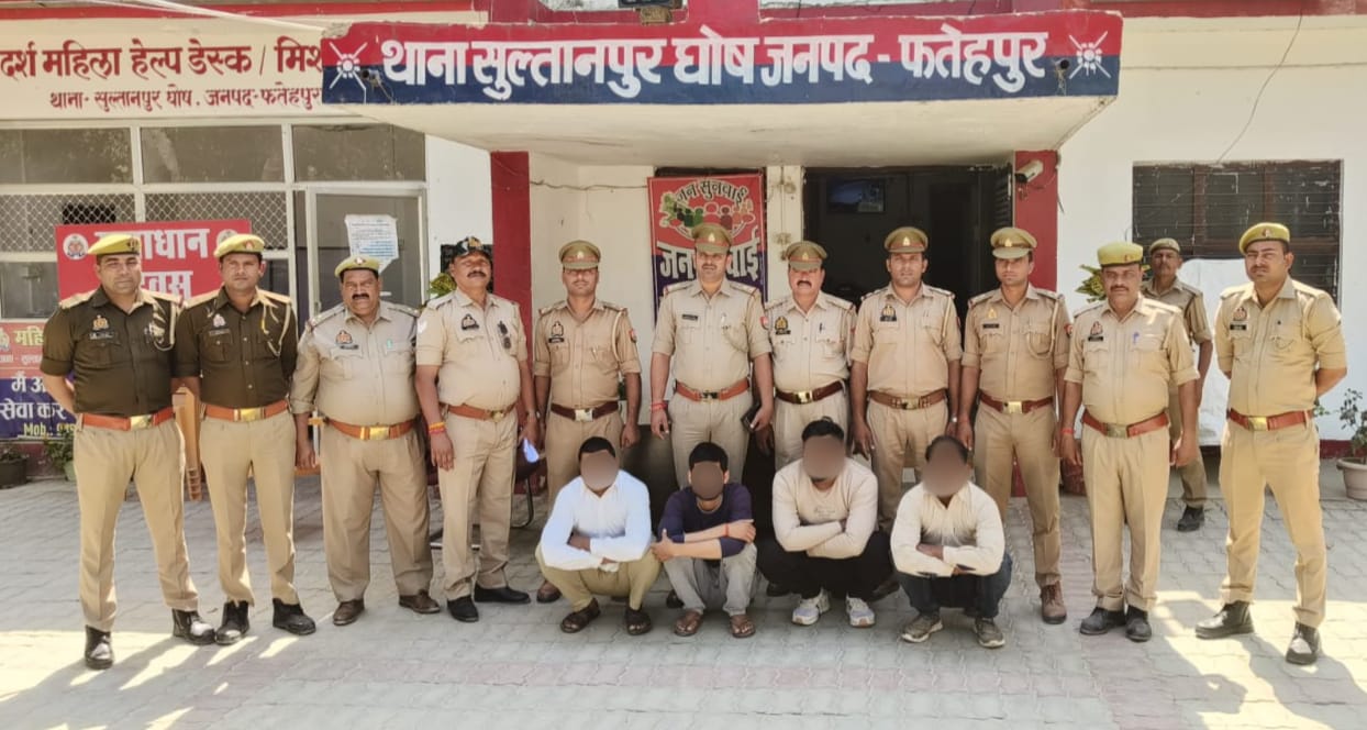 उत्तर प्रदेश फतेहपुर जिले के सुल्तानपुर घोष थाना क्षेत्र के 25–25 हज़ार रूपये के इनामिया को धोखाधड़ी करके आम जनता से करीब 150 करोड़ रूपये का गबन करने वाले गैंगेस्टर एक्ट से संबंधित चार वांछित आरोपियो को पुलिस द्वारा गिरफ्तार किया गया। पुलिस अधीक्षक द्वारा चलाये जा रहे वांछित/वारण्टी अपराधियों की गिरफ्तारी अभियान के अंतर्गत अपर पुलिस अधीक्षक के निर्देशन व क्षेत्राधिकारी खागा के निकट पर्वेक्षण में रजिस्टर्ड गैंग संख्या D-75, थाना सुल्तानपुर घोष के सदस्य गैंगस्टर एक्ट मु0अ0सं0-36/2025 घारा 2/3 गिरोहबन्द समाज विरोधी क्रिया कलाप निवारण अधिनियम-1986 में वांछित चल रहे आरोपी शत्रोहन उर्फ शत्रुधन पुत्र स्व० सुखलाल उम्र करीब 35 वर्ष निवासी ग्राम खजुरियापुर मजरे ऐरायां सादात गाँव निवासी रूपसिंह उर्फ रूपचन्द्र पुत्र शिवभजन उम्र करीब 46 वर्ष व अरूण कुमार मौर्या पुत्र गया प्रसाद मौर्या उम्र करीब 33 वर्ष और रोहित कुमार पुत्र दुर्गा प्रसाद उम्र करीब 33 वर्ष को आज थानाध्यक्ष सुल्तानपुर घोष मय पुलिस टीम द्वारा गिरफ्तार कर आवश्यक विधिक कार्यवाई करते हुये गिरफ्तार आरोपियो को न्यायालय रवाना किया गया।