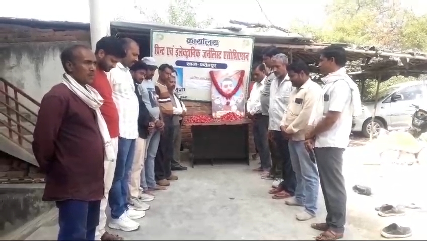 उत्तर प्रदेश फतेहपुर खागा कोतवाली क्षेत्र में खागा प्रेस क्लब तथा प्रिंट एवं इलेक्ट्रॉनिक जर्नलिस्ट एसोसिएशन के संयुक्त तत्वाधान में कोतवाली क्षेत्र के पश्चिमी बाईपास कार्यालय पर शोक सभा का आयोजन हुआ सभी लोगों ने दिवंगत पत्रकार उग्रसेन गुप्ता की प्रतिमा पर पुष्प तथा माला अर्पित किया। 2 मिनट का मौन धारण कर उनके प्रति अपनी शोक संवेदनाएं व्यक्ति की प्रेस क्लब के सम्मानित पत्रकार सरोज पांडेय ने दिवंगत पत्रकार के व्यक्तित्व पर प्रकाश डालते हुए उनके योगदान अपने विचार भी रखें। श्रद्धांजलि अर्पित करने वालों में वरिष्ठ पत्रकार अवधेश कुमार दुबे, सुशील त्रिपाठी, रितेश पांडेय इजराइलफ़रुकी, सूर्यभान त्रिपाठी, सुशील गौतम विश्व हिंदू परिषद से शिव स्वरूप विश्वकर्मा, संतोष विश्वकर्मा सत्य प्रकाश दुबे प्रमोद यादव, सुनील विश्वकर्मा, विनोद वर्मा रामदयाल विनोद श्रीवास्तव अनूप कौशल राममहेश राजेश सिंह महामंत्री आदि उपस्थित रहे।