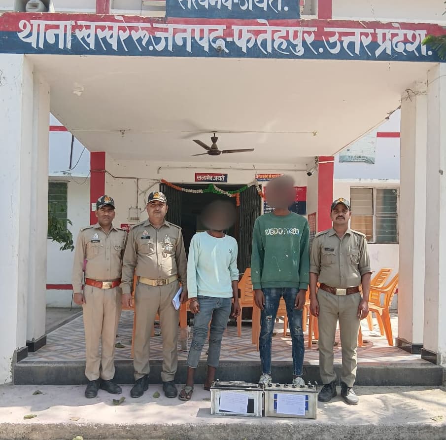 उत्तर प्रदेश फतेहपुर खखरेरू थाने पुलिस द्वारा चोरी से सम्बंधि दो वांछित आरोपियो को मय माल ट्रैक्टर की बैटरी के साथ गिरफ्तार किया गया। पुलिस अधीक्षक धवल जायसवाल के निर्देशन में वांछित/वारण्टियों की गिरफ्तारी व अपराध एवं अपराधियों के विरुद्ध चलाये जा रहे अभियान में आज थाना पुलिस द्वारा थाना स्थानीय पर पंजीकृत मु0अ0सं0 63/2025 धारा 303(2) बीएनएस से संबंधित आरोपी मो0 कौनेन उर्फ टोबो पुत्र नबी अहमद उम्र करीब 21 वर्ष, विनय रैदास पुत्र सितालू उम्र करीब 20 वर्ष कस्बा निवासी को डाकघर खखरेरु से बरहटा जाने वाले रास्ते वेस्ट भट्टा के पास से गिरफ्तार कर कब्जे से चोरी की गयी ट्रैक्टर की 2 अदद बैटरी बरामद किया गया । बरामदगी के आधार पर मुकदमा में अपराध धारा 317(2) बीएनएस की बढोत्तरी करते हुए गिरफ्तार आरोपियो को न्यायालय रवाना किया गया।