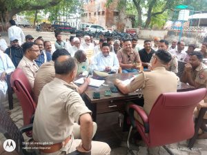 इस मौके पर क्षेत्राधिकारी ने कहा किसी भी नए मार्ग की अनुमति नहीं दी जाएगी पुराने कदीमी रास्तों पर ही ताजिया जुलूस निकाला जाएगा बैठक पर विभिन्न तरीकों को निकालने वाले जुलूस के मार्गों के बारे में चर्चा किया बैठक में प्रमुख रूप से डॉक्टर असलम अंसारी कमर अब्बास सिद्धू शाहबाज पीर मोहम्मद गोपी का महमूद आलम शेखर हनीफ मौलवी उज्जमान निजामुद्दीन कुरैशी सभासद जियाउल हक, थाना अध्यक्ष सतपाल सिंह, वरिष्ठ उप निरीक्षक रविंद्र सिंह,कस्बा प्रभारी नारद भारती, उप निरीक्षक प्रशांत मिश्रा मौजूद थे