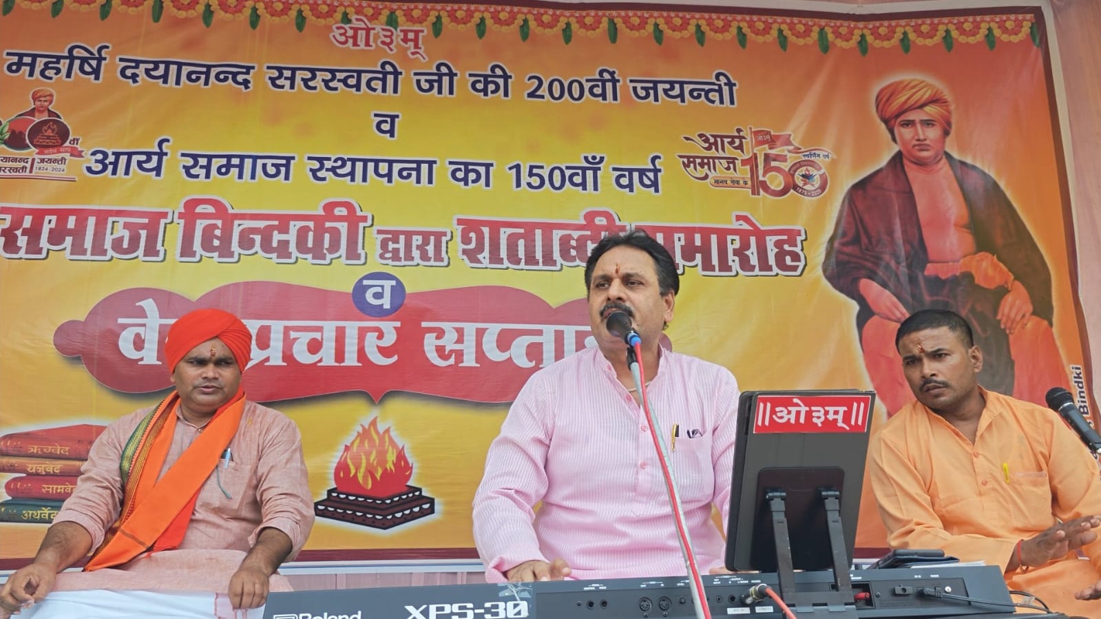 उत्तर प्रदेश फतेहपुर जिले की बिंदकी कोतवाली क्षेत्र में आर्य समाज के शताब्दी समारोह के दूसरे दिन देश के कोने-कोने से आए विद्वानों ने ज्ञान की गंगा बहाई। इस मौके पर भजन उपदेशक पंडित दिनेश पथिक ने कहा कि प्रातः उठकर जो प्रभु के गुण गाएगा वही जग में अमर फल पाएगा। मौजूद अन्य विद्वानों ने कहा कि आर्य समाज की नियमों का पालन करना चाहिए और अंधविश्वास से दूर रहना चाहिए। जानकारी के अनुसार नगर के ललौली चौराहे के समीप दयानंद इंटर कॉलेज के सामने स्थित आर्य समाज मंदिर में आर्य समाज के शताब्दी समारोह के दूसरे दिन शुक्रवार को अमृतसर से आए अंतरराष्ट्रीय भजन उपदेशक पंडित दिनेश पथिक ने भजन के माध्यम से लोगों को संदेश दिया की जो प्रातः उठकर प्रभु के गुण गाएगा वही जग में अमर फल पाएगा। तमाम व्याधियों के बाद भी उसे समस्या नहीं होगी। कार्यक्रम में सहारनपुर से आए वेद उपदेशक आचार्य शिव कुमार शास्त्री ने कहा कि हम सभी को आर्य समाज के नियमों का पालन करना चाहिए तभी जीवन सार्थक होगा। कार्यक्रम में भूदेव शास्त्री ने भी लोगों को अंधविश्वास से दूर रहने की बात कही। कार्यक्रम का शुभारंभ हवन पूजन और यज्ञ से हुआ। इस मौके पर आर्य समाज के प्रधान श्रवण कुमार ओमर, मंत्री इंद्र धर गुप्ता, कोषाध्यक्ष कृष्ण कुमार गुप्ता, दयानंद इंटर कॉलेज के प्रबंधन वेद प्रकाश गुप्ता, नगर पालिका के पूर्व अध्यक्ष अरविंद कुमार गुप्ता उर्फ पप्पू, डॉ महेशआर्य प्रेम धर गुप्ता, चंद्रशेखर गुप्ता वीरेंद्र गुप्ता, जय कुमार आर्य यदुनंदन आर्य, जयदेवसिंह, वासुदेव सिंह सहित भारी संख्या में लोग मौजूद रहे