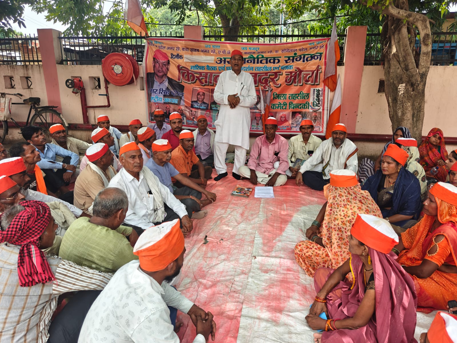 उत्तर प्रदेश फतेहपुर जिले की बिंदकी कोतवाली क्षेत्र में किसान मजदूर मोर्चा की बैठक में मुख्य अतीत के रूप में मौजूद मोर्चा के राष्ट्रीय अध्यक्ष अमर सिंह पटेल ने कहा कि किसान मजदूर आयोग का गठन किया जाए और उसे संवैधानिक दर्जा भी दिया जाए उन्होंने कहा कि तमाम विकास के दावे करने वाली सरकार में किसानों को ठीक से खाद भी नहीं मिल पा रही है। सत्ता में आने के पहले किसानो की आय दुगनी करने की बात कही गई थी लेकिन आज किसान परेशान है वह कर्ज लेकर अपना काम चल रहा है। नगर के तहसील परिसर में सोमवार को दिन में करीब 1:00 बजे किसान मजदूर मोर्चा की एक बैठक हुई। बैठक में मुख्य अतिथि के रूप में मोर्चा के राष्ट्रीय अध्यक्ष अमर सिंह पटेल मौजूद रहे। इस मौके पर उन्होंने कहा कि किसान मजदूर आयोग का गठन हो तथा उसे संवैधानिक दर्जा दिया जाए। महिलाएं गांव घर में मवेशियों का पालन करती है इसलिए उन्हें भी किसान सम्मन निधि दिया जाए। उन्होंने कहा कि प्रधानमंत्री नरेंद्र मोदी ने कहा था कि किसानों की आय दुगनी की जाएगी लेकिन किसानों की आय दुगनी नहीं की गई। किसानों के हित को देखते हुए सरकार खाद तथा कीटनाशक दावों की कीमत को आधी करें। स्वास्थ्य बीमा की राशि 5 लख रुपए से बढ़कर 10 लख रुपए की जाए। वर्तमान में किसानों को डीएपी खाद नहीं मिल पा रही किसानों को पर्याप्त डीएपी खाद उपलब्ध कराई जाए। वृद्धा विधवा तथा दिव्यांग पेंशन राशि ₹5000 प्रतिमाह की जाए। इस मौके पर किसान मजदूर मोर्चा के प्रदेश सचिव महावीर गौतम के अलावा जिला सचिव प्रियंका पाल, ननकी पासवान, तहसील अध्यक्ष नीरज पटेल अरविंद पटेल जया शुभम गुप्ता चंद्रशेखर राम बहादुर कुशवाहा अनुराधा वर्मा राजदुलारी रामलाल इंद्रपाल श्रीपाल गौतम दीपक लोधी तथा मेवालाल सहित तमाम लोग मौजूद रहे।