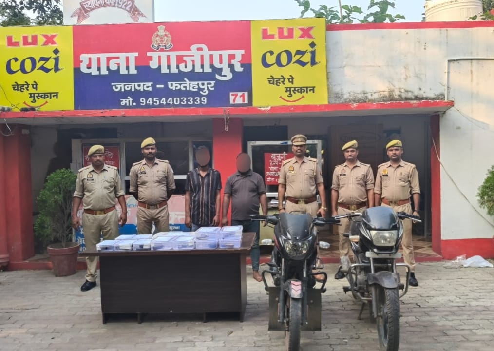 उत्तर प्रदेश फतेहपुर जिले की गाजीपुर थाने की पुलिस द्वारा बीती रात चेकिंग के दौरान अंतर्जनपदीय अवैध शस्त्र तस्कर 25 हजार रुपये का इनामिया वांछित आरोपी दो सहयोगी सहित चोरी की मोटर साइकिल व नाजायज तमंचा/कारतूस के साथ गिरफ्तार हो गया। उसकी निशादेही पर छिपाये गये अवैध शस्त्र/कारतूस की बरामदगी दौरान पुलिस मुठभेड़ में वह घायल हो गया। पुलिस द्वारा बीती रात थाना क्षेत्र के औगासी पुल पर संदिग्ध व्यक्ति/वाहन चेकिंग दौरान चोरी की मोटर साइकिल से लूट के अभियोग में वांछित/इनामिया अभियुक्त को दो सहयोगी आरोपियो के साथ फतेहपुर की तरफ से बांदा की तरफ जाने की सूचना प्राप्त हुयी। सूचना के क्रम में पुलिस टीम द्वारा सघन चेकिंग में दो मोटर साइकिल पर सवार तीन व्यक्तियों को देखकर मुखबिर द्वारा पुष्टि उपरांत पुलिस टीम द्वारा घेराबंदी कर रोकने के प्रयास पर मोटर साइकिल सवार व्यक्तियों द्वारा पुलिस को देख कर तेजी से मोड़कर भागने दौरान अनियंत्रित होकर गिर गये जिन्हें पुलिस टीम द्वारा मौके से गिरफ्तार कर नाम पता पूछने पर नाम एक ने फईम उर्फ राजू पुत्र फरीद खां निवासी निमनीपार थाना कोतवाली जनपद बांदा उम्र करीब 36 वर्ष 2. हेशाम शेख उर्फ हासिम पुत्र रफीख निवासी सिरसाल थाना रानी का सराय जनपद आजमगढ़ उम्र करीब 25 वर्ष 3. अब्दुल पुत्र स्व० सफीख निवासी निमनीपार थाना कोतवाली जनपद बांदा उम्र करीब 25 वर्ष बताया। जिनके कब्जे से चोरी की 01 अदद मोटर साइकिल, 05 अदद देशी तमंचा 315 बोर एवं 01 अदद पिस्टल 32 बोर एवं 09 अदद जिंदा कारतूस 315 बोर व 04 अदद जिंदा कारतूस 32 बोर व 01 खोखा कारतूस 32 बोर आदि बरामद हुआ।