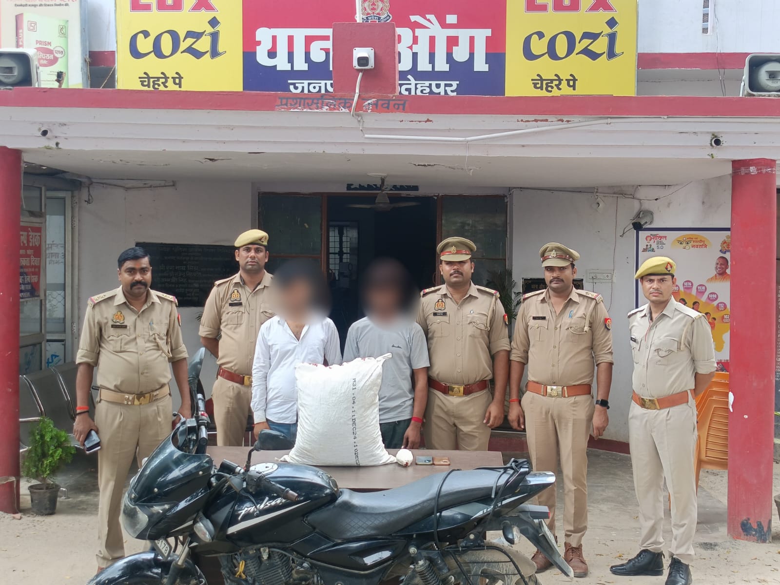 उत्तर प्रदेश फतेहपुर जिले के औंग थाने व इन्टेलीजेन्स विंग टीम की संयुक्त टीम द्वारा 02 शातिर गांजा तस्करों को 10 किलोग्राम गांजा परिवहन कर ले जाते समय मोटर साइकिल सहित गिरफ्तार किया गया। पुलिस अधीक्षक अनूप कुमार सिंह के निर्देशन में अपराध एवं अपराधियों के विरुद्ध चलाये जा रहे अभियान में नवरात्रि त्योहार के दृष्टिगत थाना औंग व इन्टेलीजेन्स विंग की संयुक्त टीम द्वारा दिनांक 29 सितम्बर को थाना औंग क्षेत्रांतर्गत संदिग्ध व्यक्ति व वाहनों की सघन चेकिंग दौरान पल्सर मोटर साइकिल संख्या UP71AW8178 पर सवार दो संदिग्ध व्यक्तियों क्रमशः 01. मनोज कुमार पुत्र स्व0 शिव नारायण निवासी दरियापुर थाना हथगाव उम्र 27 वर्ष 02. आदर्श सिंह उर्फ गोरे पुत्र बद्री सिंह निवासी खेसहन थाना गाजीपुर उम्र 21 वर्ष को एक प्लास्टिक की बोरी में पांच पैकट में कुल 10 किलोग्राम नाजायज गांजा परिवहन कर ले जाते समय गिरफ्तार किया गया। गिरफ्तारी व बरामदगी के आधार पर थाना औंग पर मु0अ0सं0 109/2025 धारा 8/20 एनडीपीएस एक्ट पंजीकृत कर विधिक कार्यवाई कर आरोपियो को न्यायालय रवाना किया गया।