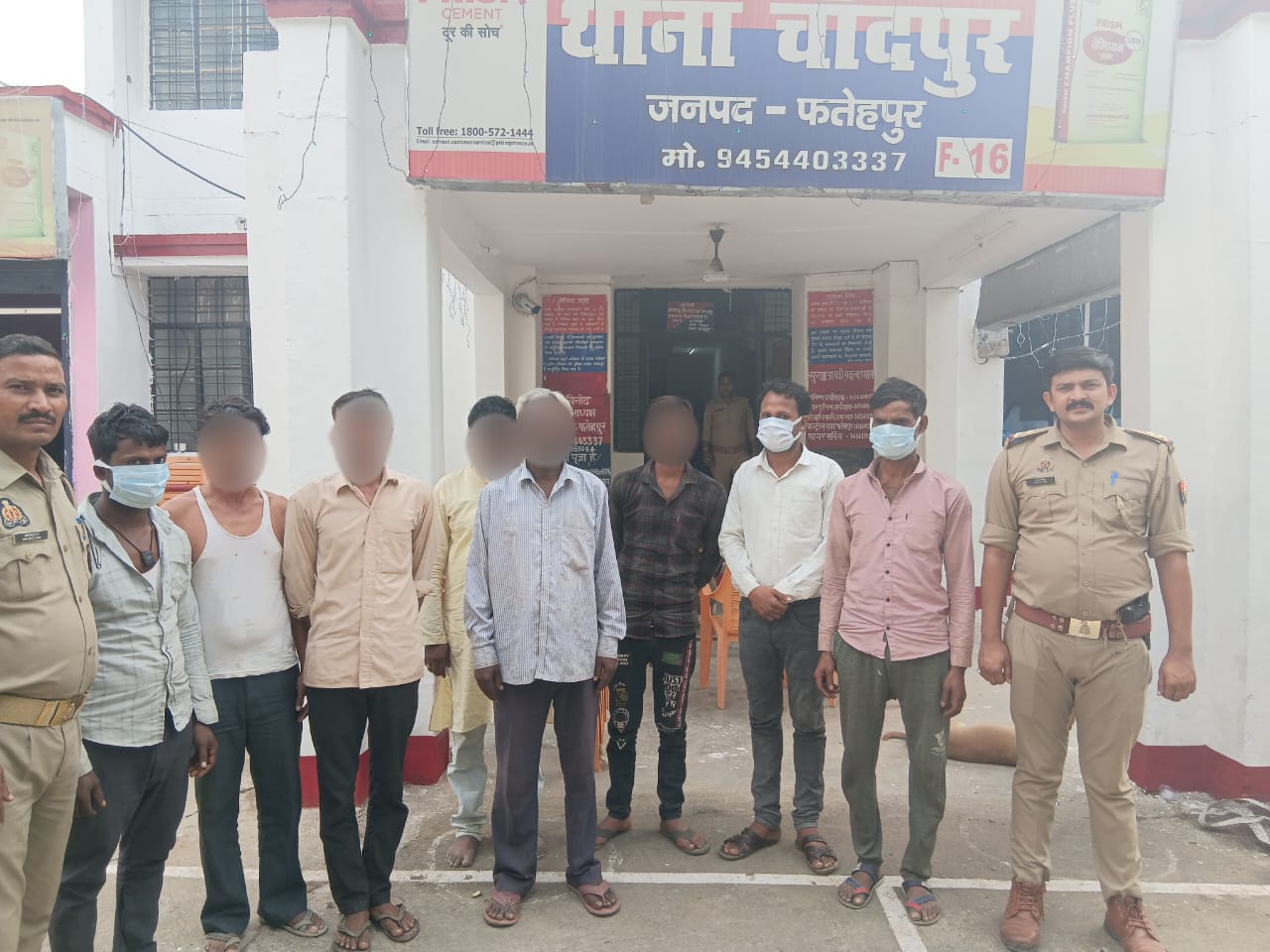 ऊत्तर प्रदेश फतेहपुर जिले की चांदपुर पुलिस द्वारा 08 जुवांडियो को जुआ खेलते हुये मय माल फड़ /जामा तलाशी 11,500/- रूपये के साथ गिरफ्तार किया गया। पुलिस अधीक्षक अनूप कुमार सिंह के निर्देशन में वांछित/वारण्टियों की गिरफ्तारी व अपराध एवं अपराधियों के विरुद्ध चलाये जा रहे अभियान में 21 अक्टूबर को थाना चांदपुर पुलिस टीम के द्वारा मुखबिर की सूचना पर 08 आरोपियो को हार-जीत की बाजी लगाकर जुआ खेलते मय मालफड़ 9510/-रूपये व जामा तलाश 1990/-रूपये व 52 अदद ताश की पत्ते कुल 11,500/- रूपये के साथ थाना क्षेत्र के अमौली गाँव निवासी नजीर के 50 वर्षीय पुत्र असलम, रामनारायण के 40 वर्षीय पुत्र राम सिंह, स्व0 चतुरी के 52 वर्षीय पुत्र ननका, महेश के 30 वर्षीय पुत्र पिन्टू चक, जीवन लाल के 32 वर्षीय पुत्र नीलू, स्व0 राम आसरे के 42 वर्षीय पुत्र प्रमोद, ननका के 23 वर्षीय पुत्र सूरज, स्व0 मूलचन्द्र के 30 वर्षीय पुत्र सूरज कुमार को गिरफ्तार किया गया। गिरफ्तारी व बरामदगी के आधार पर थाना स्थानीय पर मु0अ0सं0 135/2025 धारा 13 जुआ अधिनियम पंजीकृत कर आवश्यक विधिक कार्यवाई की जा रही है।