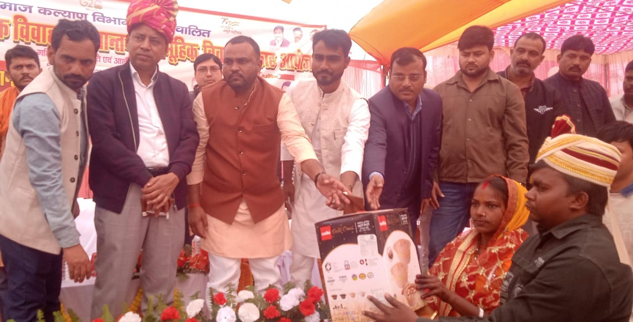 उत्तर प्रदेश फतेहपुर जिले के हसवा विकास खंड क्षेत्र के अन्तर्गत नेशनल हाईवे स्तिथि द रायल गार्डेन परिसर में शनिवार को सुबह 10 बजे से ही मुख्यमंत्री सामूहिक विवाह में 57 जोडो का पंजीकृत हुए। जिसमें सामूहिक विवाह समारोह में 51 जोड़ों ने वैदिक मंत्रोच्चार के बीच सात फेरे लेकर दांपत्य जीवन के लिए आचार्यों ने आशीर्वाद दिया गया। आयोजन स्थल पर पारंपरिक सजावट किया गया। ढोल-नगाड़ों और मंगलगीतों के बीच विवाह की रस्में 21 आचार्यों द्वारा संपन्न कराई गईं। सुबह से ही वर-वधुओं और उनके परिजनों की चहल-पहल बनी रही। मुख्य अतिथि ब्लॉक प्रमुख विकास पासवान एवं बीडीओ अशोक कुमार सिंह ने नव विवाहित जोड़ों को आशीर्वाद देते हुए कहा कि सामूहिक विवाह जैसे आयोजन सामाजिक समरसता बढती है। आर्थिक मदद मिलने से गरीबों की बेटियों के हाथ पीले हो रहे हैं। इससे समाज में व्याप्त दहेज जैसी कुरीतियों पर अंकुश लगता है और जरूरतमंद परिवारों को सम्मान के साथ बेटियों का विवाह संपन्न कराने का अवसर मिलता है। उन्होंने नव दम्पतियों से परस्पर विश्वास, प्रेम और सहयोग के साथ जीवन पथ पर आगे बढ़ने को कहा। समारोह के दौरान थरियांव एस ओ राजेन्द्र सिंह ने और हसवा चौकी इंचार्ज अरूण मौर्य ने सुरक्षा व्यवस्था देखा। अधिकारियों ने भी वर-वधुओं को शुभकामनाएं दीं। आयोजन समिति ने नव दंपति को गृहस्थी का सामान भेंट किया। विवाह के बाद सामूहिक भोज का आयोजन हुआ। इस मौके पर हसवा ब्लॉक प्रमुख विकास पासवान, बीडीओ अशोक कुमार सिंह, एडीओ पंचायत कौशलेन्द्र सिंह, जिला समाज कल्याण अधिकारी अवनीश यादव, नोडल प्रभारी उप कृषि निदेशक सत्येंद्र सिंह, तहसीलदार लक्ष्मी बाजपेई, एपीओ नितिन श्रीवास्तव,हसवा समाज कल्याण ललित कुमार, आईएसबी धर्मपाल सोनी,रामबाबू कुशवाहा,राजू मौर्य, अकिंता सिंह, मनोज कुमार, नरेश कुमार, सलोनी मिश्रा, चंद्र प्रकाश सिंह , हसवा ग्राम प्रधान राशिद राइन, प्रदीप यादव, धीरेंद्र सिंह यादव, जवाहरलाल, कमलेश यादव, दीपक दुबे,जयकरन, सुखराम, भानू, लेखपाल अजीजउद्दीन, राकेश कुमार, जगदीश, सहित अन्य जनप्रतिनिधि मौजूद रहे।