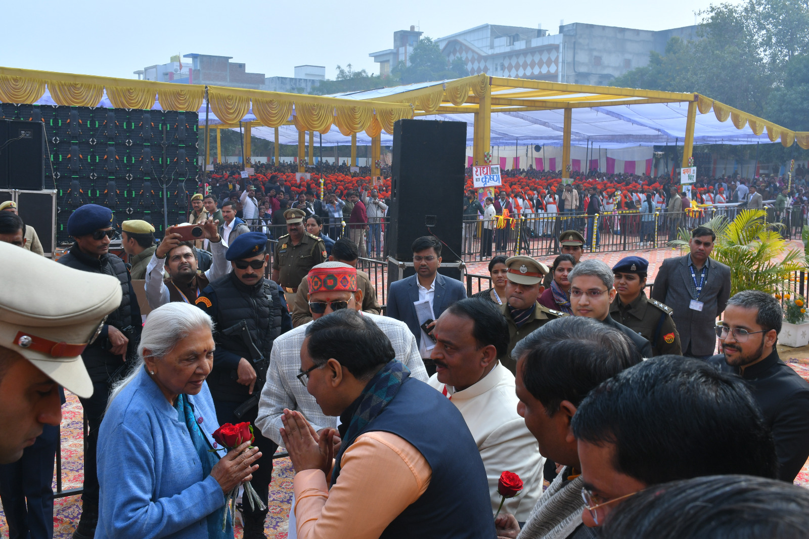जनपद में लाईट हाउस मॉडल पर आधारित आदर्श आंगनबाड़ी केन्द्र बनाया गया है, जिसमें बच्चों को स्थानीय वातावरण में ही प्रारंभिक बाल्यावस्था में सीखने के अवसर बढ़ने के लिए बाल संवेदी कार्नर, मानसिक बौद्धिक विकास करने वाले खिलौने, दीवारों पर विभिन्न प्रकार के रंगीन चित्र, केन्द्र के बाहर प्राकृतिक एवं जलवायु अनुकूल गार्डन आदि भी निर्मित किए गए है। उन्होंने कहा कि महोदया जी आपके प्रेरणा से केन्द्र/राज्य सरकार द्वारा संचालित जन कल्याणकारी योजनाओं, कार्यक्रमों, नीतियों, निर्णयों का लाभ नागरिकों तक पहुंचाने का निरन्तर प्रयास किया जा रहा है। जिलाधिकारी ने राज्यपाल को प्रतीकचिन्ह व स्वयं सहायता समूहों द्वारा तैयार किए गए उत्पाद तथा पुस्तक भेंट की। कार्यक्रम के अंत में विद्यालय प्रबंध समिति के उपाध्यक्ष राकेश वर्मा ने राज्यपाल एवं आए हुए अतिथियों का आभार व धन्यवाद ज्ञापित किया। इस मौके पर जिला पंचायत अध्यक्ष अभय प्रताप सिंह, जिलाधिकारी रविन्द्र सिंह, पुलिस अधीक्षक अनूप कुमार सिंह, मुख्य विकास अधिकारी पवन कुमार मीना, डॉ0 सौरभ मालवीय क्षेत्रीय मंत्री पूर्वी उत्तर प्रदेश, डॉ0 राकेश निरंजन मंत्री भारतीय शिक्षा समिति कानपुर प्रान्त, राम प्रकाश पोरवाल मंत्री भारतीय शिक्षा समिति, जगदीश क्षेत्रीय शारीरिक प्रमुख कानपुर प्रांत, अयोध्या प्रसाद मिश्र जी प्रदेश निरीक्षक कानपुर प्रान्त विद्यालय के अध्यक्ष आनंद स्वरूप रस्तोगी, विद्यालय के प्रबंधक लोक सेवा आयोग के सदस्य डॉ0 हरेश प्रताप सिंह, विद्यालय के प्रधानाचार्य नरेंद्र सिंह सहित भरी संख्या में छात्र/छात्राएं एवं उनके अभिभावकगण, अधिकारी व कर्मचारी उपस्थित रहे।