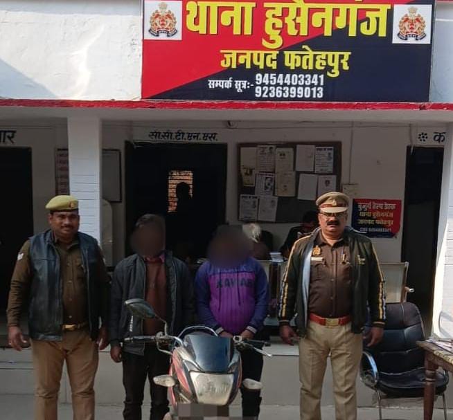 उत्तर प्रदेश फतेहपुर जिले के हुसैनगंज थाने की पुलिस द्वारा चोरी की घटना का खुलासा करते हुये संलिप्त दो आरोपियो को चोरी की मोटर साइकिल के साथ गिरफ्तार किया गया। पुलिस अधीक्षक अनूप कुमार सिंह के निर्देशन में वांछित/वारण्टियों की गिरफ्तारी व अपराध एवं अपराधियों के विरुद्ध चलाये जा रहे अभियान में हुसैनगंज थानां पुलिस द्वारा दिनांक 23.12.2025 को थाना हुसैनगंज पर पंजीकृत पर मु0अ0सं0 347/2025 धारा 303(2) BNS बनाम अज्ञात, चोरी का खुलासा करते हुए बाबूगंज मोड से थानां क्षेत्र के सहनीपुर गाँव निवासी जगरूप पटेल के 36 वर्षीय पुत्र रामरूप पटेल तिवारीपुर गाँव निवासी बैजनाथ के 30 वर्षीय पुत्र जितेन्द्र राजपूत को चोरी की गयी मोटर साइकिल के साथ गिरफ्तार किया गया। गिरफ्तारी एवं बरामदगी के आधार पर मुकदमा उपरोक्त में धारा 317(2),317(4),317(5) बीएनएस की बढोत्तरी करते हुये गिरफ्तार आरोपियो को न्यायालय भेजा गया।