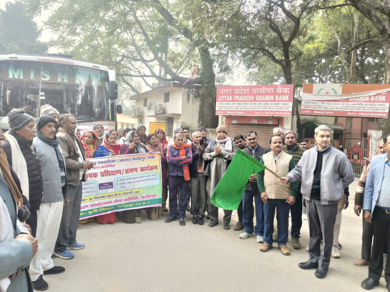 उत्तर प्रदेश फतेहपुर जिले में कृषि विभाग के तत्वाधान में प्रज्ञा ग्रामोत्थान सेवा समिति द्वारा दिनांक 26 दिसम्बर 2025 से 01 जनवरी 2026 तक सात दिवसीय अंतरराज्यीय कृषक प्रशिक्षण एवं भ्रमण हेतु जबलपुर म०प्र० स्थित आई.सी.ए.आर.- खरपतवार अनुसंधान संस्थान व जवाहर लाल नेहरू कृषि विश्वविद्यालय, एवं नाना जी देशमुख पशु चिकित्सा विश्व विद्यालय तथा नागपुर महाराष्ट्र स्थित आई. सी. ए. आर. केन्द्रीय नींबू संतरा अनुसंधान संस्थान एवं मृदा सर्वेक्षण संस्थान में भ्रमण एवं अध्ययन हेतु जनपद के 50 किसानों के भ्रमण दल को जिलाधिकारी रवीन्द्र सिंह ने कलेक्ट्रेट परिसर से हरी झंडी दिखाकर रवाना किया। उन्होंने कहा कि कृषि संस्थानों में खेती की आधुनिक एवं नवीनतम तकनीक हासिल करें, भ्रमण में किसानों को फसल उत्पादन तकनीक एवं मृदा सुधार हेतु जानकारी एवं नीबू संतरा तथा मुसम्मी की खेती की जानकारी मिलेगी, जिससे किसान अपनी आय में वृद्धि कर सकते हैं। जिला कृषि अधिकारी नरोत्तम कुमार जी ने कहा कि मृदा परीक्षण के आधार पर रासायनिक उर्वरकों का प्रयोग किसान करें इसके साथ ही मृदा में कार्बनिक स्तर में वृद्धि के लिए हरी खाद, कम्पोस्ट तथा देशी गाय आधारित जीवामृत का प्रयोग कर जमीन की उर्वरता में वृद्धि कर सकते हैं तभी टिकाऊ खेती होगी। भ्रमण दल का संचालन कर रहे संस्था सचिव उमेश चन्द्र शुक्ल ने कहा कि किसानों को इन संस्थानों में उन्नतिशील बीजों, फसल सुरक्षा तथा बागवानी एवं मूल्य संवर्द्धन तकनीक की जानकारी दिलायी जायेगी। भ्रमण दल में दलजीत सिंह, बजरंग सिंह, पंथू सिंह पटेल, भानुप्रताप सिह, राम सिंह पटेल, रमेश प्रसाद त्रिवेदी, बीरेन्द्र सिंह, अरूणन्जय सिंह तथा राधा देवी एवं विमलेश देवी हैं।