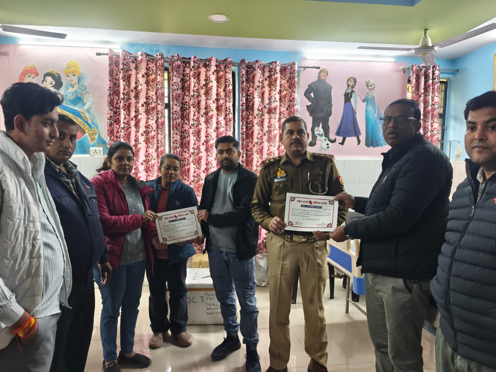 उत्तर प्रदेश फ़तेहपुर जिले की बिंदकी कोतवाली क्षेत्र में रक्तदान करने से दूसरे को जीवन दान मिलता है यह एक पुण्य कार्य है यदि शरीर स्वस्थ है तो कभी-कभी रक्तदान अवश्य करना चाहिए यह बात कोतवाली प्रभारी निरीक्षक हेमंत कुमार मिश्रा ने बिंदकी कस्बे के सामुदायिक स्वास्थ्य केंद्र में आयोजित रक्तदान शिविर में रक्तदान करने के बाद कहा। बिंदकी कस्बे के सामुदायिक स्वास्थ्य केंद्र में सोमवार की दोपहर करीब 12:00 जिला चिकित्सालय की टीम द्वारा स्वैच्छिक रक्तदान शिविर का आयोजन किया गया। जिसमें बिंदकी कोतवाली के इंस्पेक्टर हेमंत कुमार मिश्रा, सामुदायिक स्वास्थ्य केंद्र बिंदकी के चिकित्सक डॉ दिनेश कुमार के अलावा रोहित कुमार, प्रणव द्विवेदी उर्फ छोटू तथा कमल कुमार ने रक्तदान किया। इस मौके पर सामुदायिक स्वास्थ्य केंद्र बिंदकी के अधीक्षक डॉक्टर धर्मेंद्र सिंह ने रक्तदाताओं को प्रमाण पत्र दिए। कार्यक्रम में रक्तदान करने वाले कोतवाली बिंदकी के इंस्पेक्टर हेमंत कुमार मिश्रा ने कहा कि रक्तदान से दूसरे को जीवन दान मिलता है। यह पुण्य और नेक कार्य है। यदि कोई व्यक्ति स्वस्थ है तो उसे समय-समय पर रक्तदान करना चाहिए क्योंकि यह रक्त दूसरे के काम आ सकता है। इस मौके पर जिला चिकित्सालय फतेहपुर की परामर्शदाता दीपाली वर्मा, लैब टेक्नीशियन दिव्या वर्मा, सामुदायिक स्वास्थ्य केंद्र की के लैब टेक्नीशियन कमल, जेपी सिंह तथा नरेंद्र नाथ पांडे के अलावा आदर्श सिंह चौहान दर्शील कुमार तथा आशीष सिंह आदि मौजूद रहे।