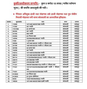 उत्तर प्रदेश फतेहपुर जिले की सदर कोतवाली पुलिस टीम व राजस्व टीम द्वारा धारा 14 (1) गैगेस्टर एक्ट के तहत कुल 5 करोड़ 15 लाख ( मार्केट वर्तमान मूल्य) की अचल सम्पत्ति कुर्क जब्त की गयी। जिलाधिकारी के आदेश में पुलिस अधीक्षक व अपर पुलिस अधीक्षक के निर्देशन में राजस्व टीम उपजिलाधिकारी सदर क्षेत्राधिकारी नगर तहसीलदार सदर एवं लेखपालगण, पुलिस टीम प्रभारी निरीक्षक तारकेश्वर राय तारकेश्वर राय मय के कुशल पर्यवेक्षण में जिलाधिकारी के आदेश वाद संख्या 1506/2025 कंप्यूटरीकृत वाद संख्या D 202502250001506 सरकार बनाम हाजी रजा मो० उर्फ हाज़ी मो० रजा अंतर्गत धारा 14 (1) अधिनियम गिरोहबंद एवं आसामाजिक क्रियाकलाप (निवारण) अधिनियम, 1986 सदर कोतवाली मुकदमा अपराध संख्या 01/2022 धारा 2/3