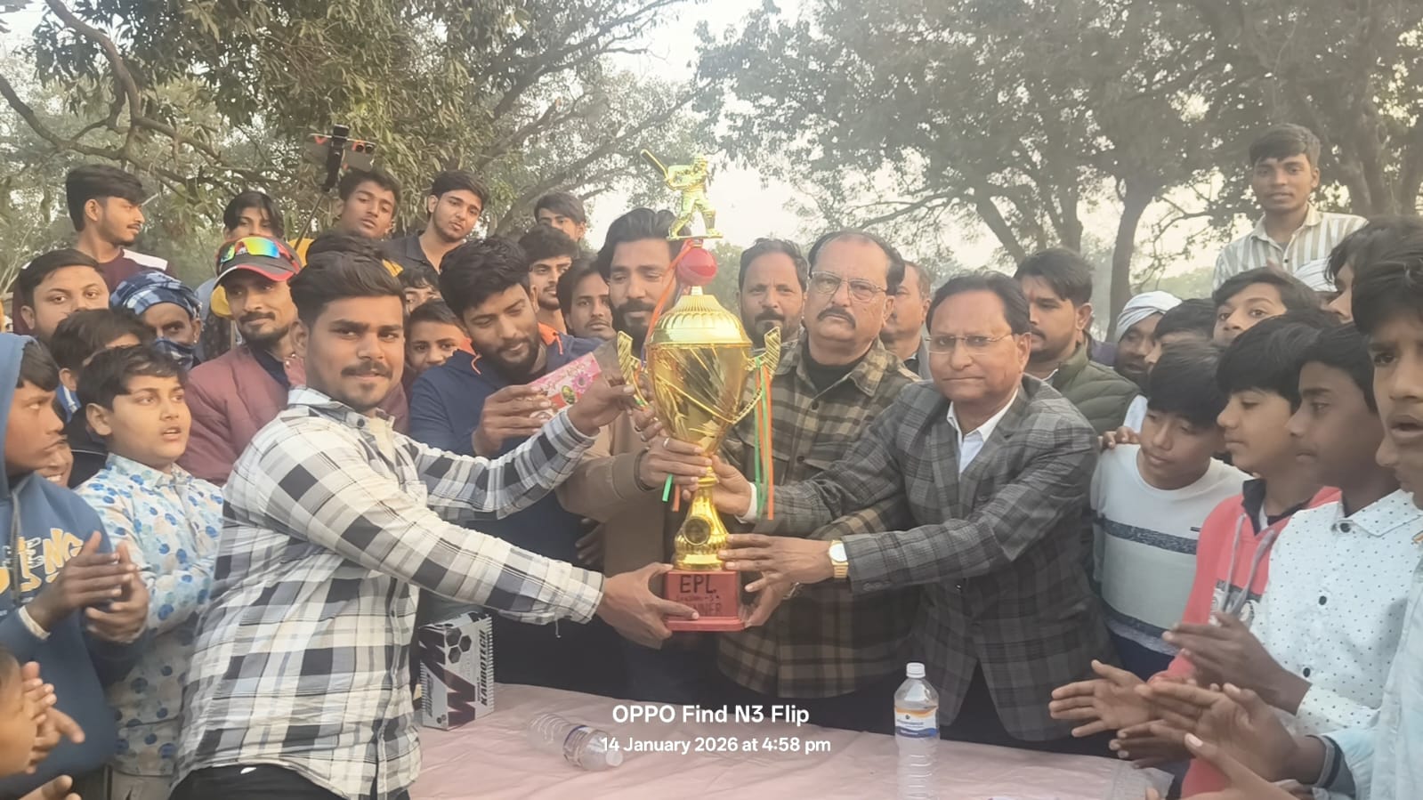 उत्तर प्रदेश फतेहपुर जिले के ऐरायां मशायख के मैदान में आयोजित क्रिकेट प्रतियोगिता के फाइनल में खागा की टीम ने ऐरायां को छह विकेट से पराजित किया। खागा की जीत में दीपेंद्र चौहान, मोहम्मद रेहान, नितिन सिंह और मोहम्मद जैद का शानदार प्रदर्शन मुख्य रहा। खागा की ओर से दीपेंद्र चौहान ने 43 रन बनाए और दो विकेट लिए, उन्हें मैन ऑफ द मैच घोषित किया गया। खागा की टीम के मोहम्मद रेहान ने 55 रन की धुआंधार पारी खेली, जबकि नितिन सिंह ने 13 गेंदों पर 35 रन ठोक डाले। मोहम्मद जैद ने 43 रन बनाकर टीम को मजबूत स्थिति में पहुँचाया। ऐरायां ने टॉस जीतकर पहले बल्लेबाजी करते हुए 14 ओवर में 193 रन बनाए। टीम की ओर से अल्तमश ने 45 रन बनाए जिसमें छह छक्के शामिल थे। साहिल ने मात्र 14 गेंदों में 42 रन की ताबड़तोड़ पारी खेली। कप्तान मो. दानिश ने 12 गेंदों में 24 रन जोड़े। खागा की ओर से नयन ने तीन और दीपेंद्र चौहान ने दो विकेट लिए। वहीं खागा की टीम धीमी शुरुआत के बाद मो. रेहान और नितिन सिंह के मजबूत प्रदर्शन से सफल रहा। अंत में खागा ने छह विकेट से ऐरायां को हराकर ट्रॉफी अपने नाम की। मुख्य अतिथि के रूप में साइबर जर्नलिस्ट एसोसिएशन के प्रदेश अध्यक्ष एवं वरिष्ठ पत्रकार शहंशाह आब्दी और विशिष्ट अतिथि कवि एवं शायर शिव शरण बंधु हथगामी ने विजेता और उपविजेता टीम के कप्तानों को ट्रॉफी और नगद राशि प्रदान की। वहीं सेमीफाइनल में खागा ने पहले खेलते हुए 176 रन बनाए और सराय की टीम को 140 रन पर ऑल आउट कर फाइनल में प्रवेश किया। इस दौरान नादिर ने 77 रन की शानदार पारी खेली और रामू ने तीन विकेट लिए। अंपायर तौसीफ वाटसन, कमेंटेटर शुभम त्रिपाठी और स्कोरर मोहम्मद मोमिन रहे। इस मौके पर रईसुल हसन, शब्बीर खान, शीबू भाई, जाहिद मान, अली नजीर, तबरेज आब्दी, मोहम्मद सैफ और खुर्शीद अंसारी सहित सैकड़ों लोग उपस्थित रहे।