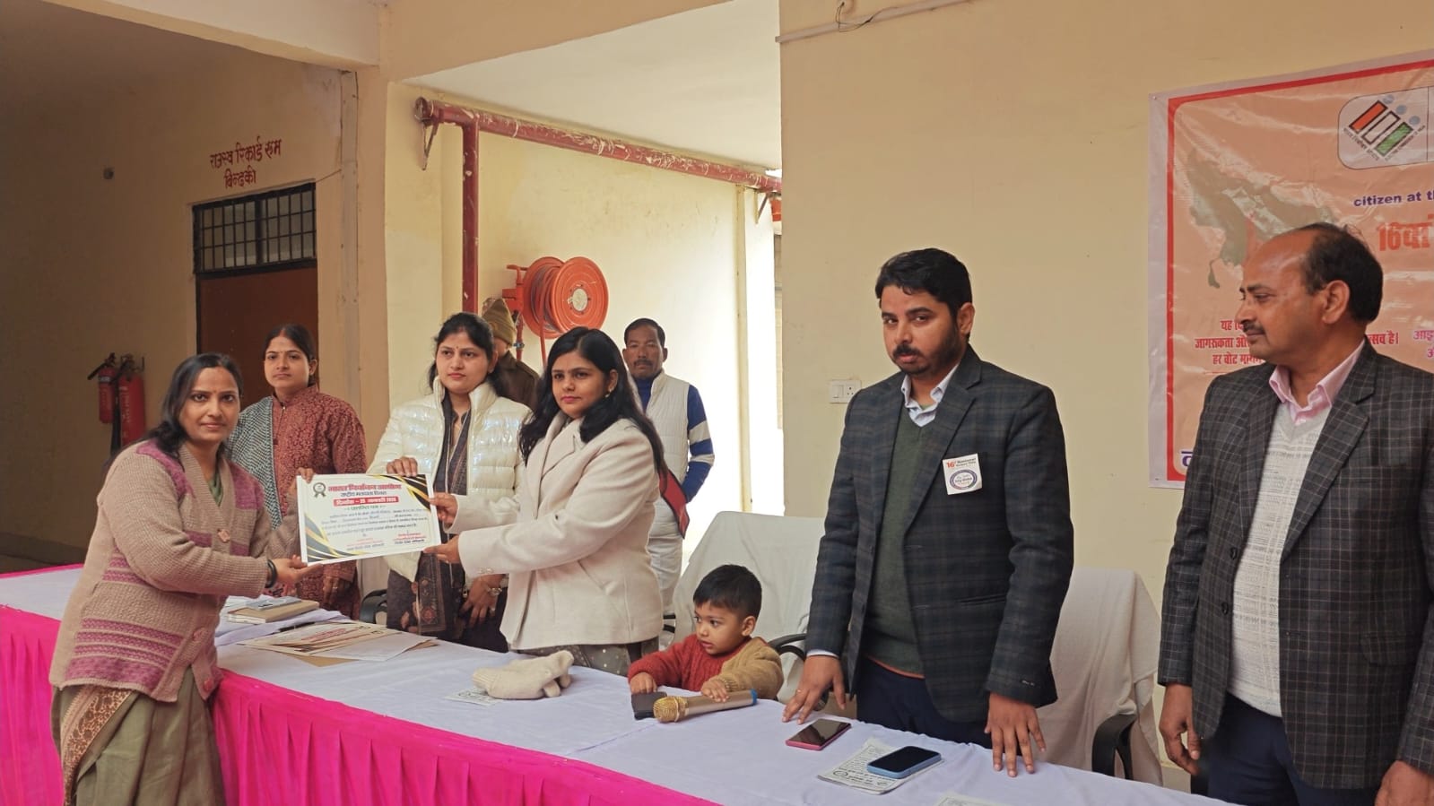 उत्तर प्रदेश फ़तेहपुर बिंदकी तहसील क्षेत्र में राष्ट्रीय मतदाता दिवस के मौके पर विभिन्न प्रकार के कार्यक्रम आयोजित किए गए तहसील में आयोजित कार्यक्रम में निर्वाचन कार्य लगन व निष्ठा से करने वाले सुपरवाइजर व बीएलओ को सम्मानित किया गया। वहीं दूसरी ओर राष्ट्रीय मतदाता दिवस के मौके पर बिंदकी कोतवाली परिसर में पुलिस क्षेत्राधिकारी ने शपथ दिलाई। बिंदकी कस्बे के तहसील परिसर में रविवार को दिन में करीब 11:00 बजे से 16 वां राष्ट्रीय मतदाता दिवस मनाया गया। इस मौके पर निर्वाचन कार्य का निर्वहन लगन एवं निष्ठा से संपादित करने के लिए सुपरवाइजर दीपक तिवारी अभय सिंह पटेल निखिल प्रताप सिंह कौशल कुमार उमेंद्र मौर्य अभिषेक कुमार तथा बूथ लेवल अधिकारी बीना देवी मोहम्मद नदीम मीनाक्षी देवी आदि को उप जिलाधिकारी श्रीमती प्रियंका अग्रवाल, तहसीलदार अचिलेश सिंह, नायब तहसीलदार सुरेश कुमार सिंह नायब तहसीलदार रचना यादव, नायब तहसीलदार प्रतिमा द्विवेदी, नायब तहसीलदार सुशील कुमार सिंह ने प्रशस्ति पत्र देकर सम्मानित किया। मतदाताओं को जागरूक करने के लिए बनाई गई रंगोली का अधिकारियों ने अवलोकन करके प्रशंसा किया। इस मौके पर कानूनगो रमेश चंद्र मिश्रा अजय कुमार मिश्रा लेखपाल संघ के अध्यक्ष कुलदीप सिंह पटेल, मंत्री दीपक तिवारी के अलावा लेखपाल अजीत उमराव उमेंद्र मौर्य अनुराग बाजपेई अभय सिंह पटेल के अलावा शिवकरण सिंह चौहान आदर्श श्रीवास्तव सुनील कुमार निखिल प्रताप सिंह पवन उत्तम योगेंद्र कुमार सुमित गुप्ता धर्मेंद्र कुमार शिव शंकर आदि लोग मौजूद रहे।