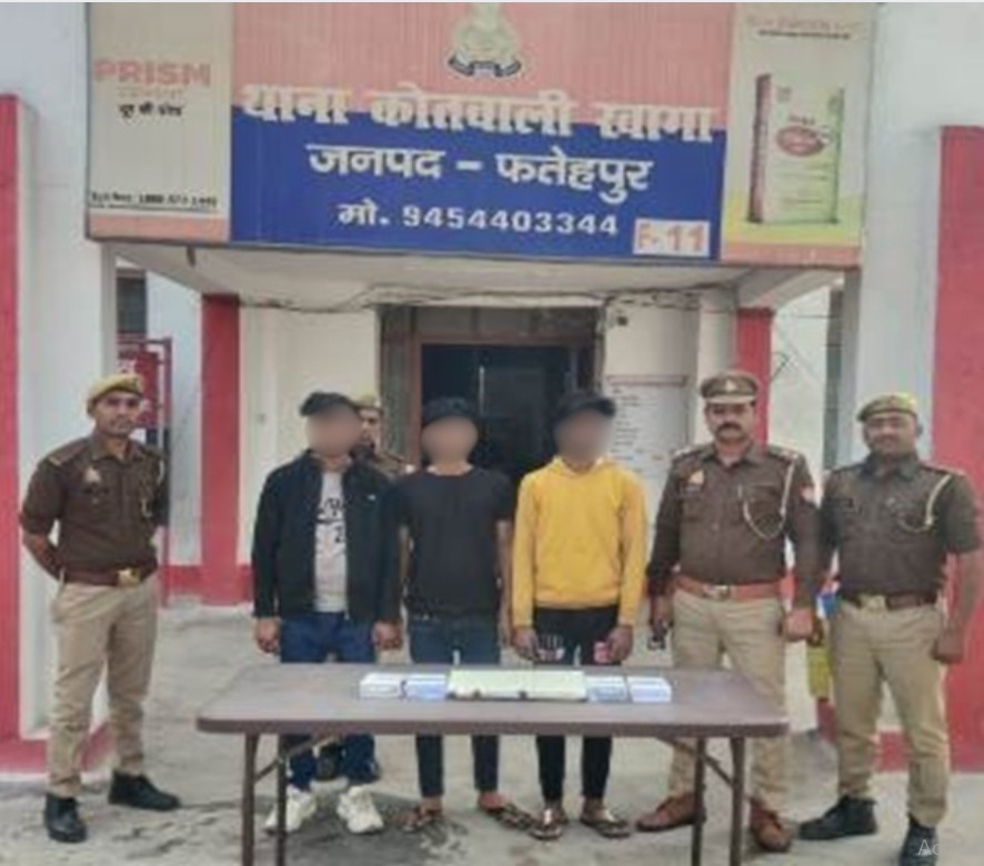 उत्तर प्रदेश फतेहपुर जिले की खागा कोतवाली पुलिस द्वारा चोरी की घटना का खलासा करते हुये संलिप्त तीन आरोपियो को चोरी के माल सहित गिरफ्तार किया गया। खागा पर पंजीकृत मु0अ0सं0 – 03/2026 धारा 305 बीएनएस बनाम अज्ञात व दिनांक 26.12.2025 को पंजीकृत मु0अ0सं0 503/2025 धारा 305 बीएनएस बनाम अज्ञात चोरी का खुलासा करते हुए आरोपी कोतवाली क्षेत्र के कस्बे के नई बाजार संतोष कुमार लोधी के 19 वर्षीय पुत्र अभि उर्फ कृष्णा व कोतवाली क्षेत्र सरसई बुजुर्ग गाँव निवासी स्व0 राम नरेश सिंह के 18 वर्षीय पुत्र अभिषेक सिंह और राधनगर थानां क्षेत्र के झाउपुर पुलिया के समीप निवासी राम प्रताप के 20 वर्षीय पुत्र राहुल को किया गया गिरफ्तार कब्जे से 01लैपटाप,01 मोबाइल एक जोड़ी पायल सफेद धातु, 04 अदद बिछिया सफेद धातु व 3200/- रुपये बरामद किया गया। गिरफ्तारी व बरामदगी के आधार पर मुकदमा में धारा 317(2) बीएनएस की बढोत्तरी करते हुये गिरफ्तार आरोपियो को न्यायालय भेजा गया। आपको बताते चले 26.12.2025 को कोतवाली क्षेत्र के कस्बा के अयोध्या नगर नौबस्ता रोड निवासी स्व0 जगजीत सिंह के पुत्र हंसराज द्वारा दी गयी तहरीरी सूचना बाबत अज्ञात चोरों द्वारा आवेदक के घर से अलमारी में रखे सोने व चांदी के जेवरात चोरी कर लिये जाने के सम्बन्ध में पंजीकृत मु0अ0सं0– 503/2025 धारा 305 बीएनएस बनाम अज्ञात व 4/2026 को कोतवाली क्षेत्र नौबस्ता बाईपास प्रियंका मैरिज निवासी आकाश वर्मा की पत्नी संजना द्वारा दी गयी तहरीरी सूचना बाबत अज्ञात चोरों द्वारा आवेदिका के घर से अलमारी में रखे सोने व चांदी के जेवरात व रुपये चोरी कर लिये जाने के सम्बंध में पंजीकृत मु0अ0सं0 03/2026 धारा 305 बीएनएस बनाम अज्ञात में केश दर्ज हुआ था।