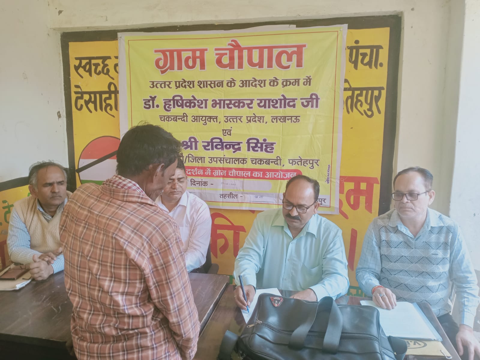 उत्तर प्रदेश फतेहपुर जनपद में जिलाधिकारी रविन्द्र सिंह के मार्गदर्शन में ग्राम टेसाही खुर्द एवं ग्राम शाहजहांपुर सेलरहा में ग्राम चौपाल का आयोजन किया गया। कार्यक्रम की अध्यक्षता उपजिलाधिकारी बिन्दकी (न्यायिक)/बंदोबस्त अधिकारी चकबंदी फतेहपुर द्वारा की गई। ग्राम चौपाल में चकबंदी अधिकारी खागा-द्वितीय, सहायक चकबंदी अधिकारी खागा-चतुर्थ, चकबंदी कर्ता एवं चकबंदी लेखपाल उपस्थित रहे। इस दौरान किसानों की समस्याएं सुनी गईं और उनके निस्तारण के लिए संबंधित अधिकारियों को आवश्यक निर्देश दिए गए। ग्राम टेसाही खुर्द में किसानों द्वारा नाम दुरुस्ती, खाता विभाजन, वसीयतनामा तथा कब्जे से संबंधित समस्याएं रखी गईं। उपजिलाधिकारी ने चकबंदी अधिकारी एवं सहायक चकबंदी अधिकारी को अभिलेखों के परीक्षण के बाद विधिसंगत कार्रवाई कर समस्याओं के समाधान के निर्देश दिए। ग्राम शाहजहांपुर सेलरहा में एक परिवादी द्वारा बैनामे की भूमि पर कब्जा न मिलने की समस्या रखी गई। इस पर अधिकारियों ने अवगत कराया कि चकबंदी के दौरान कब्जा परिवर्तन की प्रक्रिया में नियमानुसार कार्रवाई कर कब्जा दिलाया जा सकेगा। उपजिलाधिकारी ने चकबंदी समिति एवं किसानों को चकबंदी की तकनीकी प्रक्रिया की जानकारी देते हुए राजस्व अभिलेखों को सही कराते हुए चकबंदी प्रक्रिया को सुव्यवस्थित रूप से पूर्ण कराने का आश्वासन दिया।