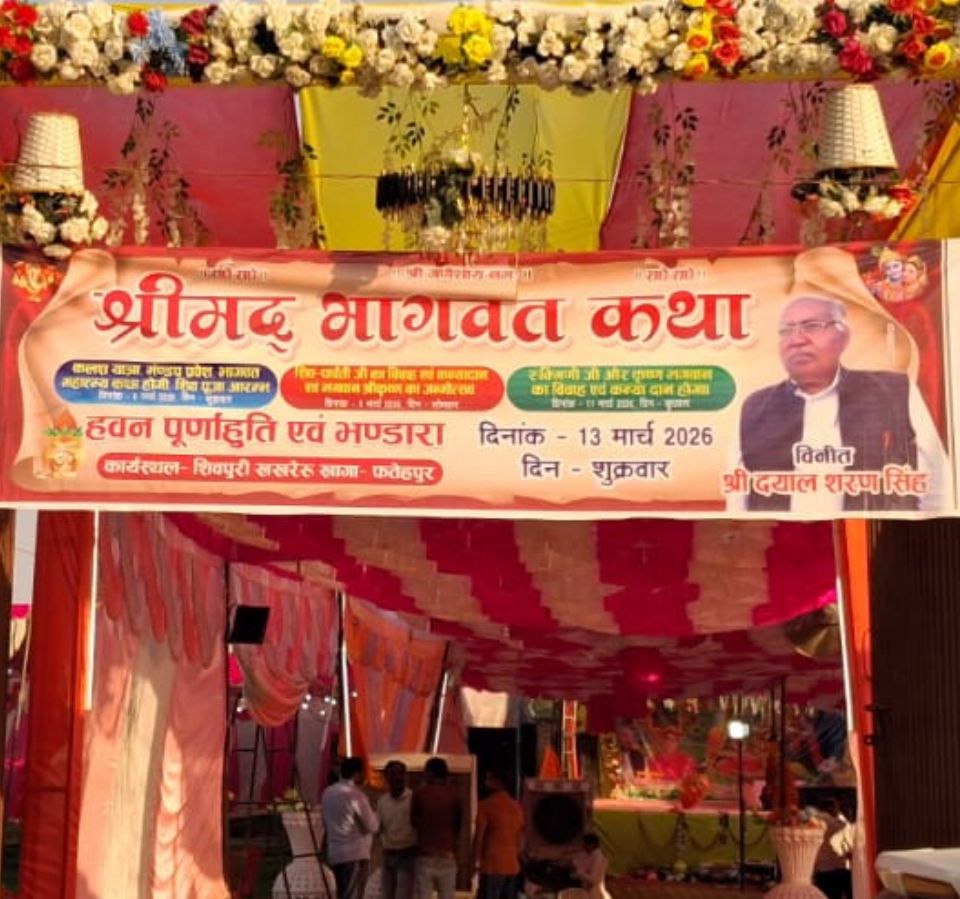 उत्तर प्रदेश फतेहपुर जिले के खागा तहसील के खखरेरू क्षेत्र के शिवपुरी गाँव मे अमर शहीद कंचन सिंह आँटो नामस पीजी महाविद्यालय के संस्थापक प्रबन्धक दयाल शरण सिंह द्वारा आयोजन करवाया गया। आपको बताते चले इस कार्यक्रम का आयोजन विगत छ:मार्च कलश यात्रा, मण्डप प्रवेश, शिवपूजा से आरम्भ होकर नौ मार्च को पार्वती जी का विवाह से लेकर ग्यारह मार्च कन्या दान से लेकर चल रही सप्त दिवसीय श्रीमद् भागवत कथा के समापन के अवसर पर आज भव्य भण्डारें का आयोजन किया गया। जिसमे क्षेत्र से व दूर दराज से चलकर आये भक्तों, नातेदारों एवं रिस्तेदारों ने प्रसाद को चखा।