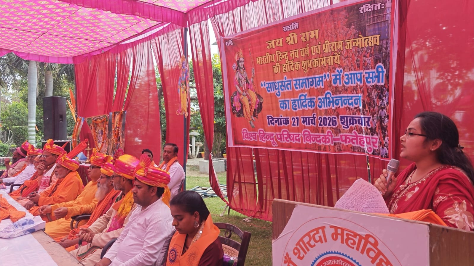 उत्तर प्रदेश फ़तेहपुर जिलें के बिंदकी कस्बे में विश्व हिंदू परिषद द्वारा साधु संत समागम कार्यक्रम का आयोजन किया गया जिसमें आए हुए साधु तथा संतों ने सनातन धर्म को मजबूत करने तथा राष्ट्र प्रेम व राष्ट्र की रक्षा पर बल दिया है। कहां की हिंदुओं में एकजुट की भावना होनी चाहिए तभी सनातन धर्म की रक्षा हो सकेगी। जानकारी के अनुसार बिंदकी कस्बे के कुंवरपुर रोड स्थित मां शारदा महाविद्यालय में शुक्रवार को दिन में करीब 11:00 बजे से विश्व हिंदू परिषद द्वारा भारतीय हिंदू नव वर्ष एवं श्री राम जन्मोत्सव के मौके पर साधु संत समागम कार्यक्रम का आयोजन किया गया। इस मौके पर हवन पूजन उपरांत विशाल भंडारे का आयोजन भी किया गया। भंडारे का शुभारंभ कन्या भोज के साथ किया गया। इसके बाद साधु संतों को भोजन कराया गया इसके बाद लगातार भंडारा चला रहा जिसमें कई हजार लोगों ने प्रसाद पाया और धन्य हुए। साधु संत समागम कार्यक्रम में साधु संतों को सम्मानित भी किया गया। साधु संत समागम कार्यक्रम के मुख्य अतिथि डंडी आश्रम के रामास्वामी ने सनातन धर्म की मजबूती राष्ट्र रक्षा और सामाजिक एकता पर जोर दिया उन्होंने हिंदू एकता पर बल दिया तथा कुरीतियों को मिटाकर भाईचारे का संदेश दिया। कार्यक्रम के मुख्य वक्ता कानपुर प्रांत धर्माचार्य संपर्क प्रमुख गणेश शर्मा ने नैतिक मूल्यों और सत्संग के माध्यम से समाज को सही दिशा दिखाने की बात कही।