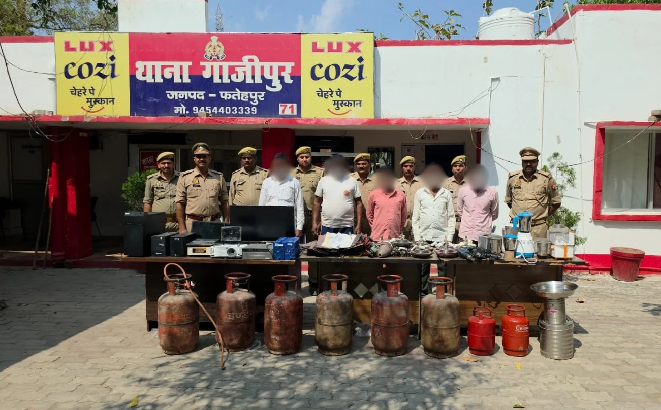 उत्तर प्रदेश फतेहपुर जनपद में स्कूलों में हो रही चोरी की घटनाओं का पुलिस ने सफल खुलासा करते हुए पांच शातिर चोरों को गिरफ्तार किया है। आरोपियों के कब्जे से चोरी का सामान और चोरी में इस्तेमाल होने वाले औजार भी बरामद किए गए हैं। इस कार्रवाई में शामिल पुलिस टीम को 15 हजार रुपये का नकद पुरस्कार भी दिया गया है। बुधवार को पुलिस अधीक्षक अभिमन्यु मांगलिक ने प्रेस कॉन्फ्रेंस कर बताया कि थाना गाजीपुर क्षेत्र के कम्पोजिट विद्यालय सोनबरसा बहुआ में 20 मार्च और 30 मार्च 2026 की रात अज्ञात चोरों द्वारा ताला तोड़कर कंप्यूटर सिस्टम, गैस सिलेंडर और रसोई का सामान चोरी कर लिया गया था। इस मामले में थाना गाजीपुर में मुकदमा दर्ज कर पुलिस जांच में जुटी थी। एसपी ने बताया कि अपराधियों की गिरफ्तारी के लिए चलाए जा रहे अभियान के तहत अपर पुलिस अधीक्षक के पर्यवेक्षण और पुलिस उपाधीक्षक जाफरगंज के नेतृत्व में थाना गाजीपुर पुलिस, इंटेलिजेंस विंग और एसओजी की संयुक्त टीम ने कार्रवाई की। मुखबिर की सूचना पर 1 अप्रैल को कोतवाली क्षेत्र के शांतिनगर मोहल्ले में अंशु सोनी के मकान में किराए पर रह रहे राकेश विश्वकर्मा के कमरे में छापा मारकर पांच लोगों को चोरी का सामान बांटने की तैयारी करते समय पकड़ लिया गया। गिरफ्तार अभियुक्तों में राकेश विश्वकर्मा निवासी रमवां थाना राधानगर, अरविंद कुमार निवासी लोधीगंज थाना कोतवाली, वीरेंद्र कुमार लोधी निवासी मिट्ठनपुर खुराना थाना कोतवाली, सुरेश कुमार लोधी निवासी मिट्ठनपुर खुराना थाना कोतवाली और गुलाम रसूल निवासी घोसियाना ज्वालागंज थाना कोतवाली शामिल हैं। पुलिस ने इनके कब्जे से छह बड़े और दो छोटे गैस सिलेंडर, कंप्यूटर से जुड़े उपकरण, पंखे, मिक्सी, ड्रिल मशीन, प्रोजेक्टर, एलईडी मॉनिटर, रसोई के बर्तन सहित बड़ी मात्रा में सामान और चोरी में इस्तेमाल होने वाले औजार बरामद किए हैं। पूछताछ में आरोपियों ने बताया कि वे गांवों में स्थित स्कूलों की पहले रेकी करते थे और रात में ताला तोड़कर गैस सिलेंडर, कंप्यूटर, पंखे और बर्तन चोरी कर लेते थे। चोरी का सामान सस्ते दामों में बेचकर उससे मिलने वाले पैसों से अपने परिवार का खर्च चलाते थे। आरोपियों ने राधानगर, थरियांव, कल्याणपुर, हुसैनगंज और बिंदकी क्षेत्रों के स्कूलों में भी चोरी की घटनाएं करना स्वीकार किया है। पुलिस ने सभी आरोपियों को गिरफ्तार कर न्यायालय में पेश कर दिया है। इस सफल कार्रवाई के लिए पुलिस अधीक्षक ने टीम को 15 हजार रुपये के नकद पुरस्कार से सम्मानित किया है।