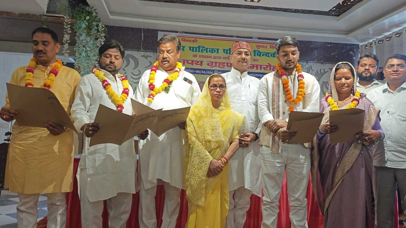 उत्तर प्रदेश फ़तेहपुर जिले की बिंदकी नगर पालिका के पांच नामित सभासदों को अपर उप जिलाधिकारी द्वारा शपथ दिलाई गई। इस मौके पर नामित सभासदों के समर्थकों में भारी उत्साह का माहौल देखा गया। शपथ ग्रहण के दौरान भारी संख्या में लोग मौजूद रहे। बिंदकी कस्बे के मुगल रोड स्थित काशी काम्लेक्स में बुधवार को दिन में करीब 3:00 बजे से नगर पालिका परिषद के पांच नामित सभासदों सोमवती निषाद, बृजेश मिश्रा, गुलशन गुप्ता, वेदांस प्रजापति तथा सुल्तान सिंह को अपर उप जिलाधिकारी प्रदीप कुमार रमन ने शपथ दिलाई। शपथ ग्रहण समारोह के दौरान नामित सभासदों के समर्थकों में भारी उत्साह का माहौल देखने को मिला। इस मौके पर नगर पालिका परिषद बिंदकी की चेयरमैन राधा साहू ने कहा कि नगर पालिका के 25 निर्वाचित तथा पांच नामित कुल 30 सभासदों द्वारा नगर पालिका बिंदकी के अंतर्गत आने वाले क्षेत्र में लगातार विकास कराया जाएगा। नायब तहसीलदार सुशील कुमार, अधिशासी अधिकारी नगर पालिका चंद्र कृष्णा पांडे राजस्व निरीक्षक रविंद्र कुमार सोनकर अवर अभियंता आराधना पटेल अवर अभियंता योगेश गुप्ता प्रधान लिपिक मनोज कुमार शुक्ला के अलावा भाजपा नेता प्रमोद द्विवेदी बैजनाथ वर्मा वीरेंद्र दुबे भाजपा मंडल अध्यक्ष बिंदकी पूरन सिंह सभासद आनंद सोनकर सभासद पप्पू शाह सभासद विक्रम उत्तम पटेल सभासद मोतीलाल निषादविजय कुमार साहू उर्फ़ काजू साहू भाजपा नेत्री रन्नो गुप्ता स्वाती ओमर सहित भारी संख्या में लोग मौजूद रहे