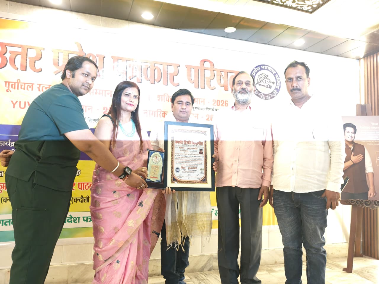 उत्तर प्रदेश कौशाम्बी जिले के विकासखंड मंझनपुर के कंपोजिट विद्यालय कोतारी पश्चिम के प्रधानाध्यापक अतुल प्रकाश प्रजापति को शिक्षा के क्षेत्र में उत्कृष्ट सेवा व नवाचार के लिए काशी विद्या पीठ वाराणसी की ओर से मानद डॉक्टरेट उपाधि से सम्मानित किया गया है। यह सम्मान उन्हें शिक्षा में गुणवत्ता सुधार, नवाचार व छात्रों के हित में किए गए उल्लेखनीय कार्यों के लिए प्रदान किया गया। रविवार को भगवान भोलेनाथ की नगरी वाराणसी में आयोजित एक संगोष्ठी में शिक्षा की गुणवत्ता, नवाचार व विद्यार्थियों के सर्वांगीण विकास पर चर्चा की गई। इसी दौरान अतुल प्रकाश प्रजापति को उनके उत्कृष्ट योगदान के लिए उत्तर प्रदेश पत्रकार परिषद के संरक्षक आनंद कुमार श्रीवास्तव द्वारा सम्मानित किया गया। कार्यक्रम में एआरपी मंझनपुर डॉ. रामनरेश विशाल व दयाशंकर विश्वकर्मा भी उपस्थित रहे। ज्ञात हो कि प्रदेश में 6 से 14 वर्ष के बच्चों को अनिवार्य एवं निःशुल्क शिक्षा उपलब्ध कराने के लिए बेसिक शिक्षा विभाग निरंतर प्रयासरत है। इसी क्रम में परिषदीय विद्यालयों में गुणवत्तापूर्ण शिक्षा प्रदान करने में अतुल प्रकाश प्रजापति की भूमिका सराहनीय रही है। डॉक्टरेट की मानद उपाधि मिलने पर क्षेत्र के शिक्षकों व सहयोगियों में खुशी की लहर है। सभी ने उन्हें बधाई देते हुए उनके उज्ज्वल भविष्य की कामना की है।